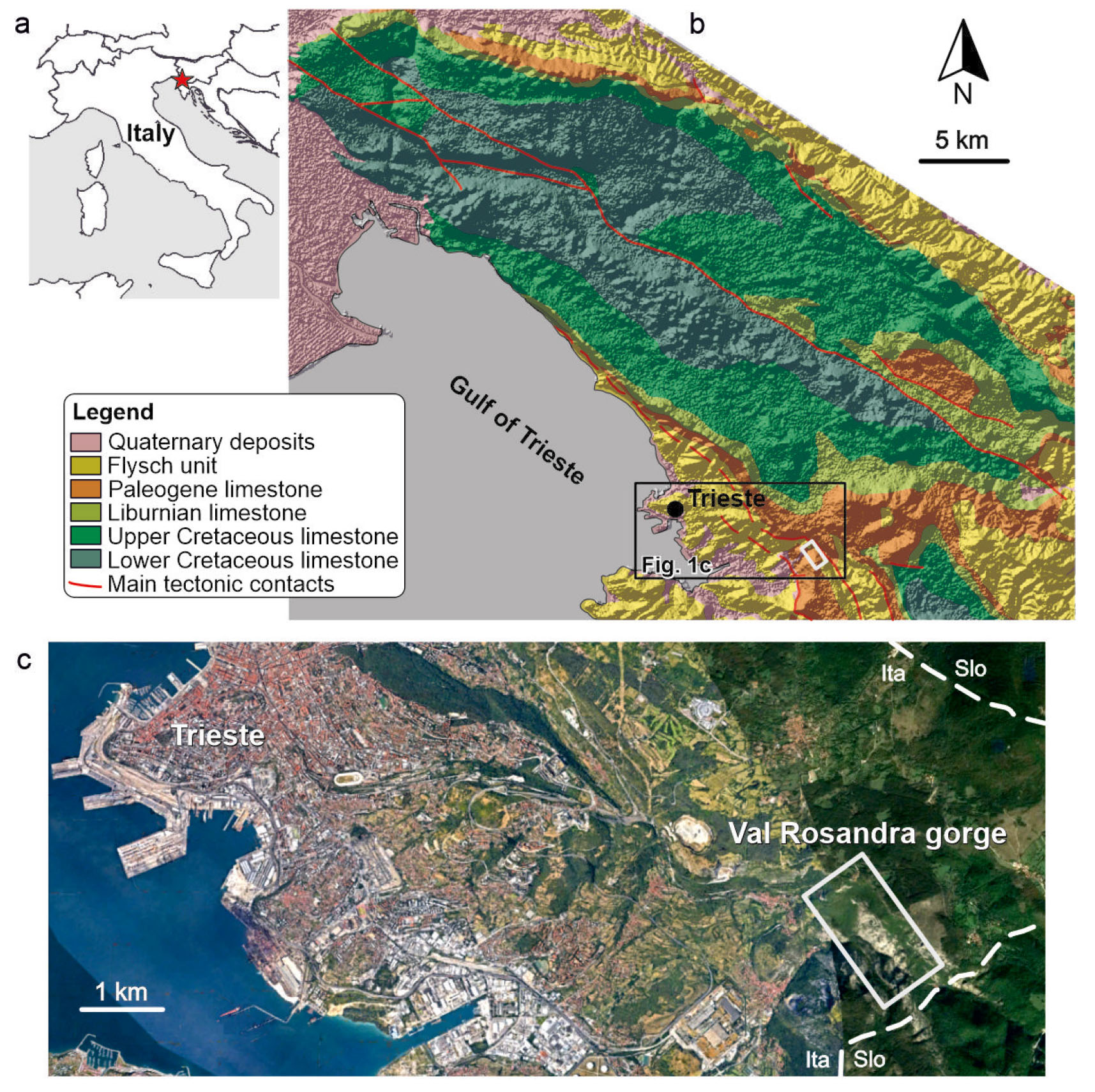 - (a) Map of Italy with the position of the studied area (red star). (b) Simplified geological map of the Karst Region, simplified from Jurkovšek et alii (2016). (c) Position of the Val Rosandra gorge within the Trieste municipality (taken from Google Earth).