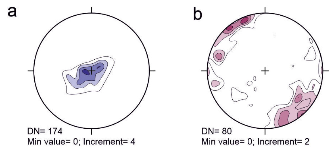 - Lower hemisphere equal-area projections of cumulative density contour of poles to bedding (a) and to faults and fractures (b). DN is the data number.
