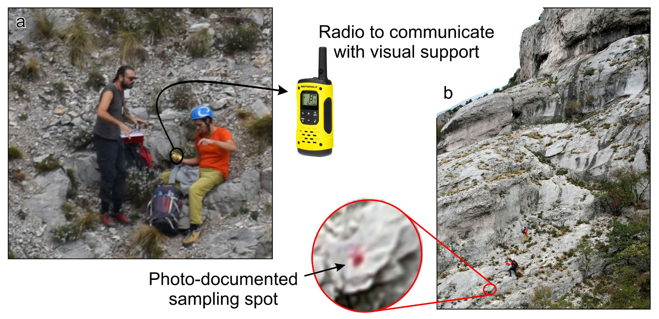 While guiding the team working along the section and operating the drone, the support team was kept up to date with the sampling tag number so that, with the help of an iPad Pro, the position of the samples was noted over panoramic photographs of the cliff. Every now and then, the stratigraphic sampling position was marked with a red dot on the rock (Fig. 2b), which was promptly photographed from the drone or using a Single Lens Reflex (SLR) with a telephoto lens to preserve drone batteries. This documentation made by the support team was very important since the accurate geotag of the samples could not be resolved by the team in charge of the sampling using a handheld GNSS receiver. Indeed, a handheld GNSS receiver, like, for example, a smartphone, would not be resolutive enough on this very steep cliff since a small horizontal position uncertainty may lead to a very large vertical error.