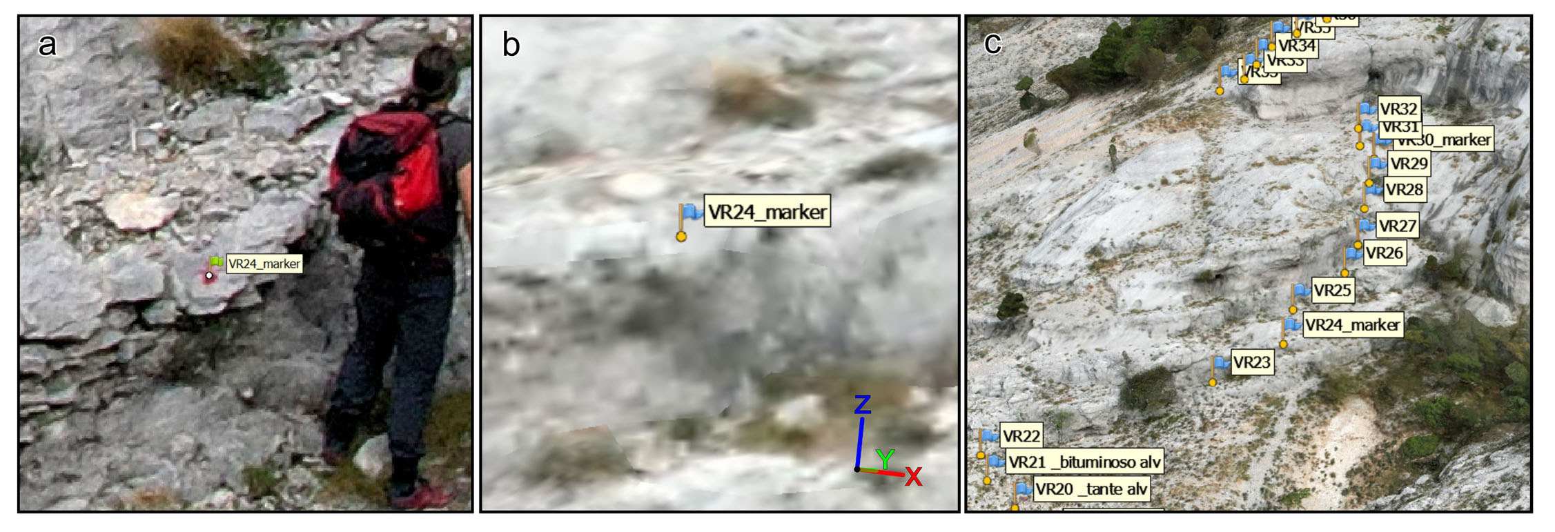 Since not all of the sampling spots were marked on the outcrop, their identification in Metashape occurred in two phases. First, all marked spots were identified in the model from the aligned images (Fig. 4a). In essence, the spots were identified from the images and Metashape repositioned them in the 3D space (Fig. 4b). The sampling spots that were not marked were positioned thanks to photographs and notes taken on the iPad from the visual supporting team with assistance from the surveyors who carried out the sampling. This procedure allowed identifying all the sampling spots in the 3D model (Fig. 3e; 4c).