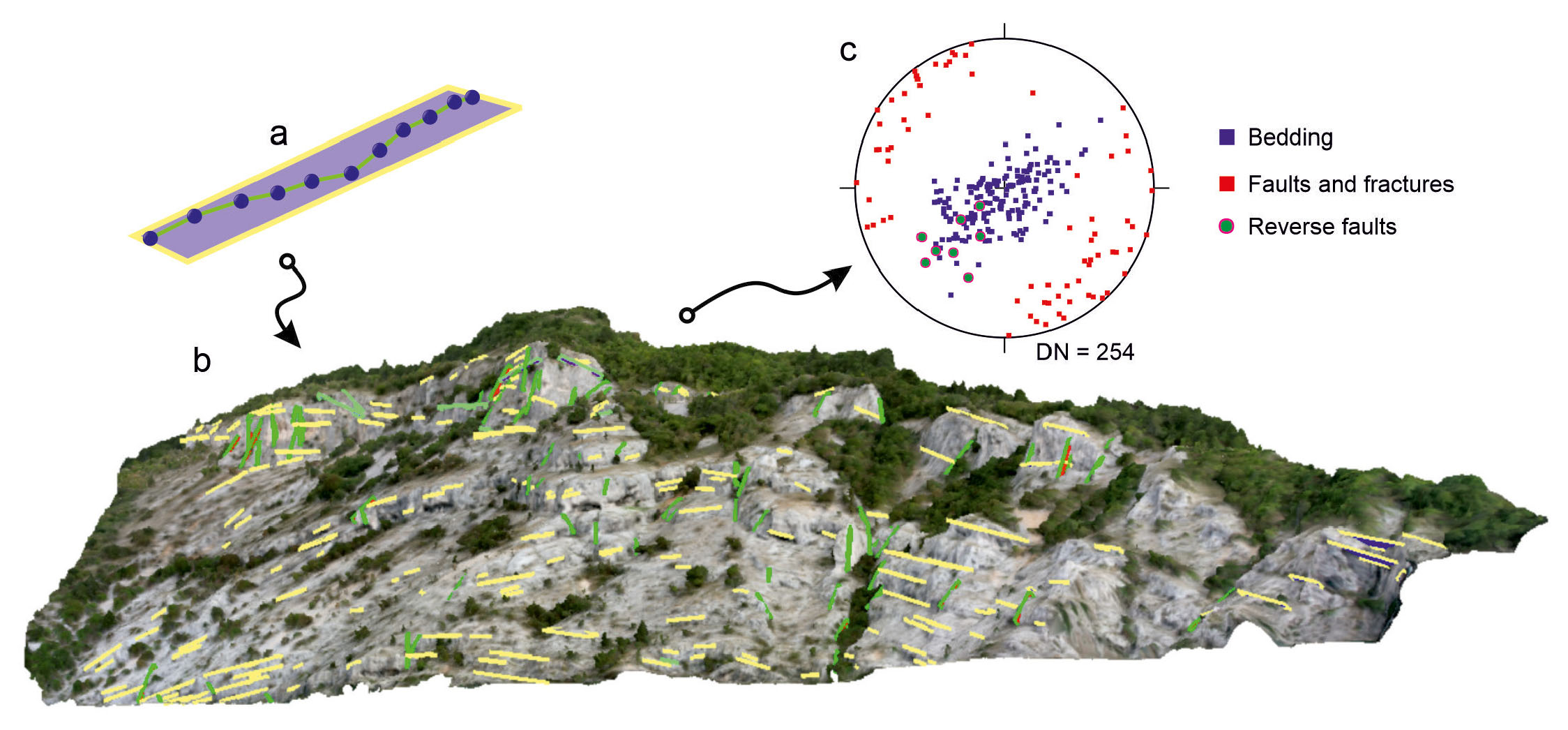 - (a) Example of a best-fit plane from a polyline. (b) Perspective view (30°) from the South of the virtual outcrop model interpreted in Openplot. Bedding planes are depicted as rectangles with a yellow outline, while faults and fractures have a green outline. (c) Lower hemisphere equal-area projections of poles to bedding and faults. DN is the number of planar features extracted.