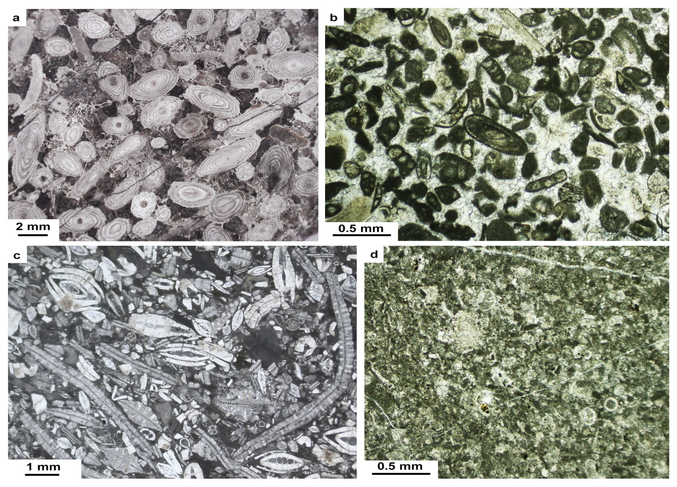 - Facies examples of the Val Rosandra gorge “miliolid, Alveolina and Nummulites limestone” unit, from the sampled column. (a) Alveolina grainstone deposited as a bioclastic lag in proximal platform setting, polished slab, sample VR9c. (b) Well-sorted fine-grained grainstone of inner platform setting, thin section, sample VR22. (c) Nummulites-Operculina-orthophragminid packstone (floatstone) of mid-platform setting, lower photic zone, thin section, sample VR64. (d) Hemipelagic fine-grained wackestone-packstone with planktonic foraminifera, thin section, sample VR70. (a): reflected light; (b-d): transmitted light.