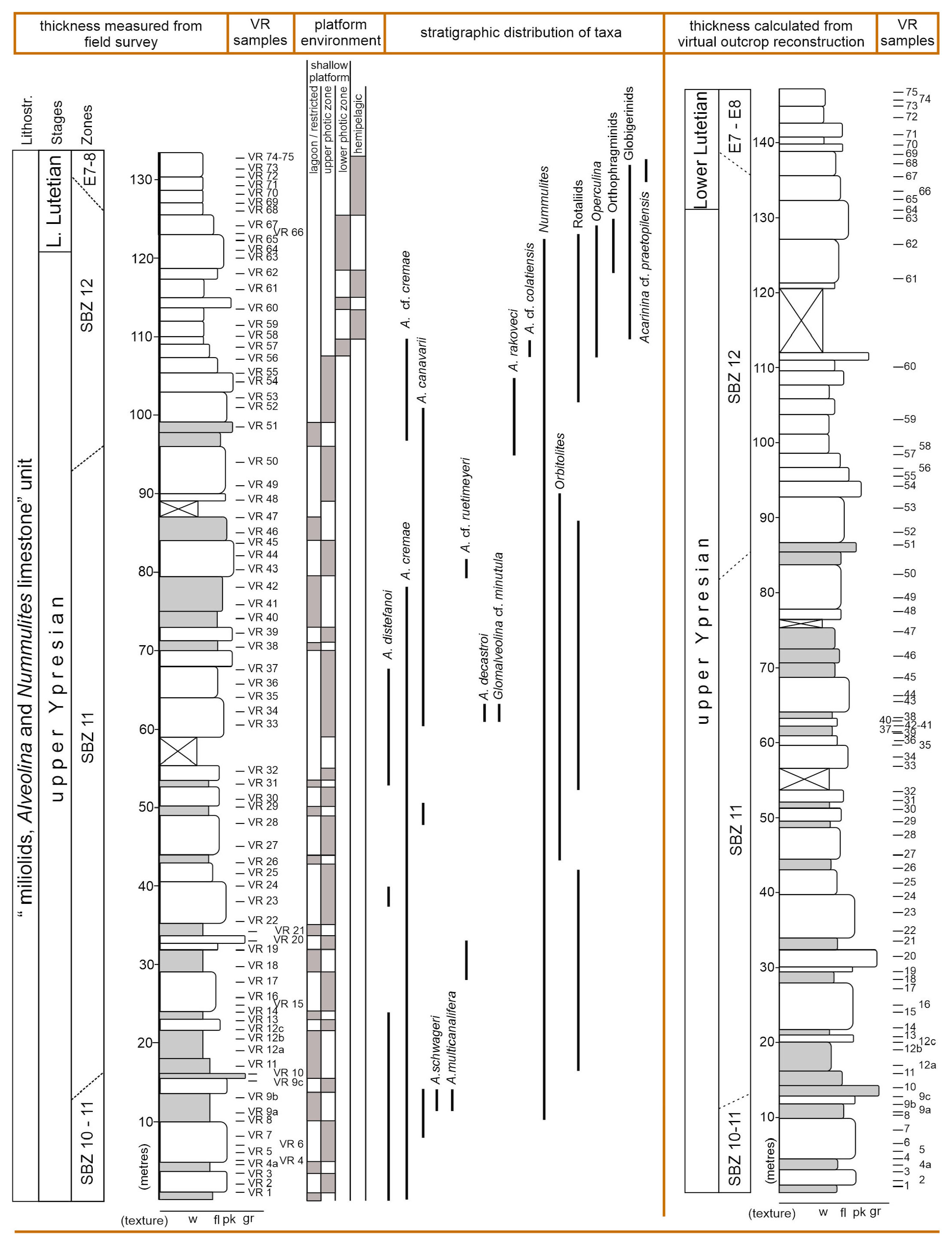 The objective of this study is threefold: (i) demonstrate the potential advantages offered by the integration of virtual outcrop modeling in stratigraphic investigations; (ii) build a potential reference section for the Eocene lithostratigraphic unit outcropping in the area which is included in the sheet 110 (Trieste) of the CARG project; (iii) provide a detailed biostratigraphic frame of the sampled section by applying SBZs, mostly based on the vertical range of species of the foraminiferal genera Alveolina, and, secondarily, on plankton biozonation for the hemipelagic portion.