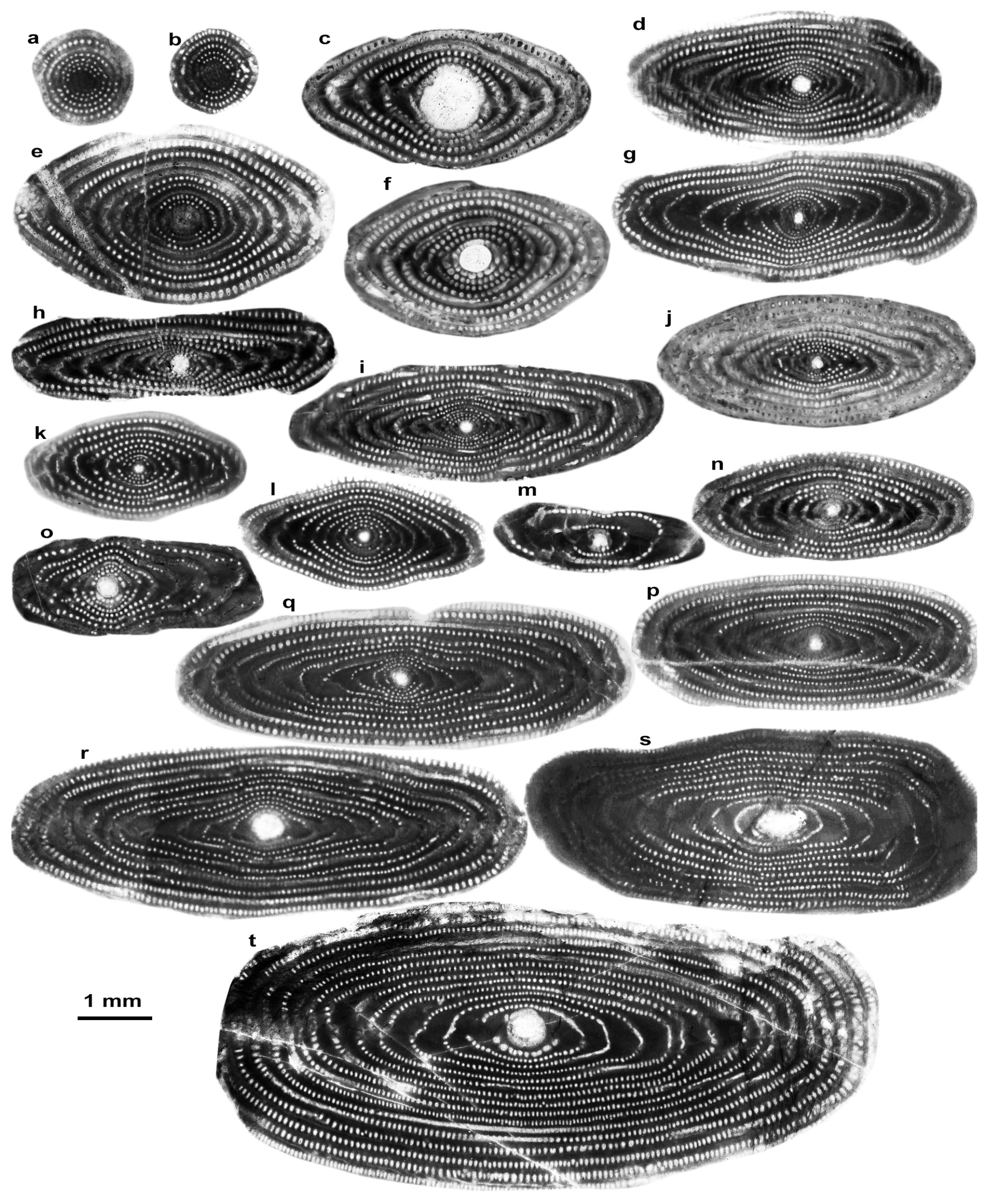 - Negative pictures of Alveolina from polished slabs. Axial, slightly oblique centered sections of megalospheric Alveolina from the Val Rosandra section (Adriatic Carbonate Platform): (a, b) Glomalveolina cf. minutula (Reichel), sample VR34/1; AC11/1. (c-f) A. cremae Checchia-Rispoli, samples VR9; VR25; VR58, 5; AC11/2. (g-i) A. distefanoi Checchia-Rispoli, sample VR7/5; VR9/41; VR32/2. (j) A. schwageri Checchia-Rispoli, VR 33/2. (k, l) A. decastroi Scotto di Carlo, sample VR33/1; VR43/1. (m) A. canavarii Checchia-Rispoli, sample VR20/3. (n) A. cf. ruetimeyeri Hottinger, sample VR17/1. (o) A. multicanalifera Drobne, sample VR9/50. (p) A. cf. colatiensis Drobne, sample VR58/2. (q-r) A. frumentiformis Schwager, sample AC58/1-AC59/1. (s) A. histrica histrica Drobne, sample AC27/1; AC71/2. (t) A. rakoveci Drobne, sample VR50/1.
