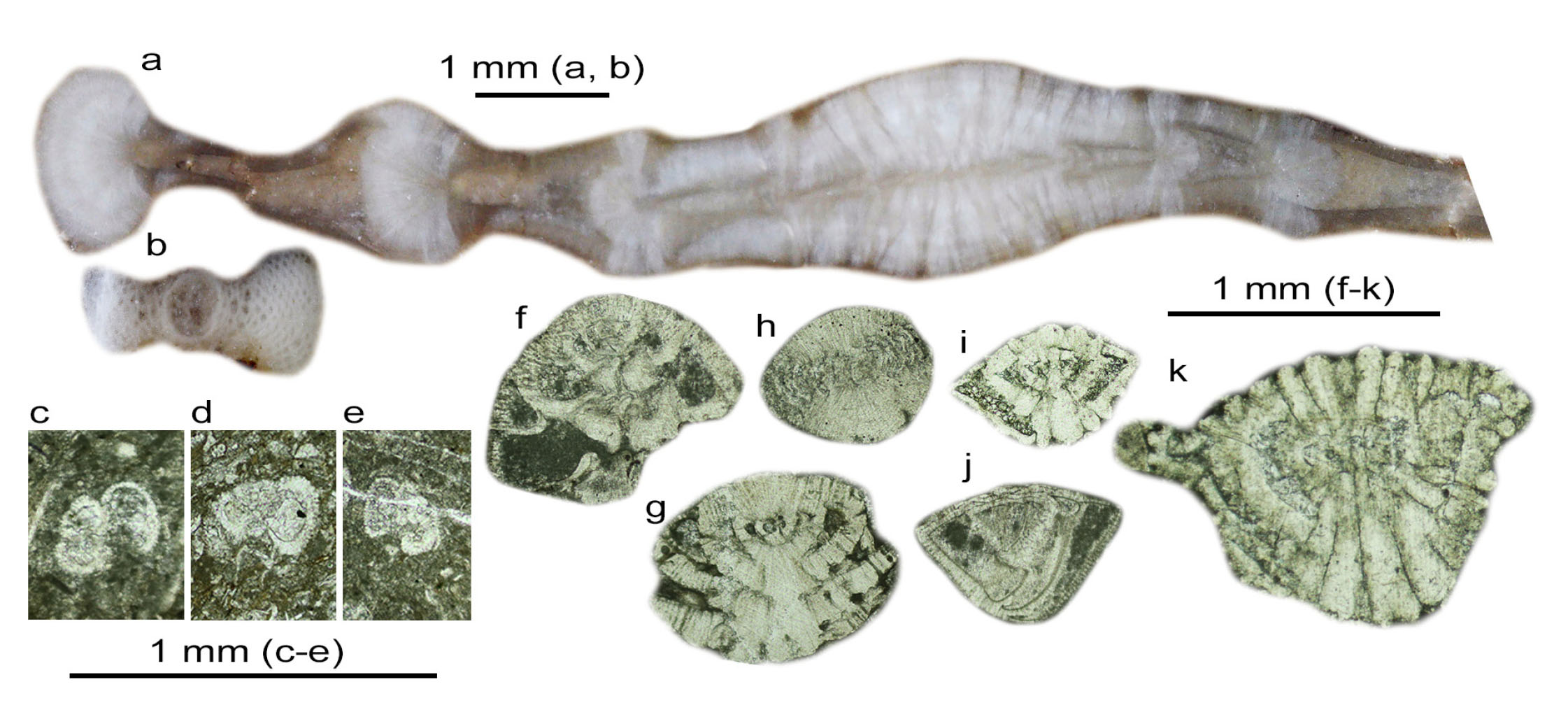 - Fig. Associate foraminiferal fauna from Val Rosandra gorge - (a) Ranikothalia sp. polished slab, sample AC70-2. (b) Orbitolites sp. polished slab, sample VR42. c) Globigerinidae, sample VR61. (d, e) Acarinina cf. praetopilensis, sample VR74 and VR75. (f) Rotalia trochidiformis, sample VR65. (g) Slovenites sp. sample VR15. (h) Linderina sp. VR65. (i) Neorotalia cf. litothamnica, sample VR68. (j) Eponides sp. (or Sanetschella Ferrandez-Canadell and Baumgartner-Mora), sample VR64. (k) Ornatorotalia spinosa, sample VR60.