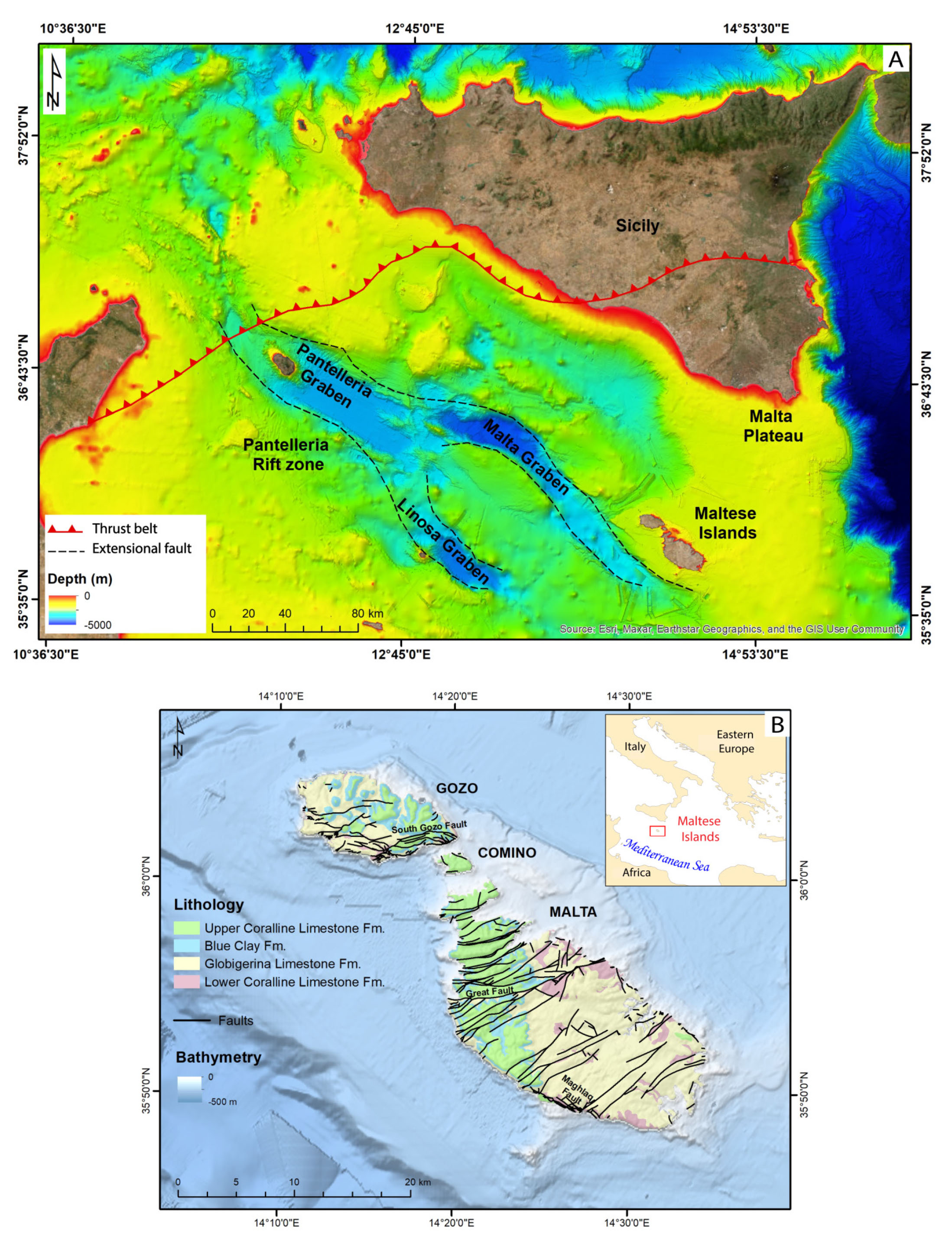 The structural framework of the Maltese Islands (Fig. 1) is influenced by two fault systems, which are a consequence of the tectonic processes affecting the central Mediterranean, as elucidated by Biolchi et al. (2011). The oldest fault system, dating back to the early Miocene, has a WSW-ENE orientation and is the result of regional stress relief, which led to the characteristic horst and graben topography observed in the Maltese Islands (Galea, 2019). The main manifestations of this system are the Great Fault and the South Gozo Fault (Baldassini et al., 2017). The more recent fault system, which originated between the late Miocene and early Pliocene, is still active and has a NW-SE orientation. It controls the Malta, Pantelleria and Linosa grabens resulting in the Pantelleria Rift Zone and defining the topography of the seabed in the area between Sicily and Tunisia. Its most evident feature is the Maghlaq Fault (Illies, 1981; Jongsma et al., 1985; Reuther & Eisbacher, 1985; Dart et al., 1993). The Maltese Islands can be classified into three primary structural regions: the Malta Horst, the North Malta Graben and, on the Island of Gozo, the Gozo Horst (Pedley et al., 1976, 1978; Scerri, 2019).