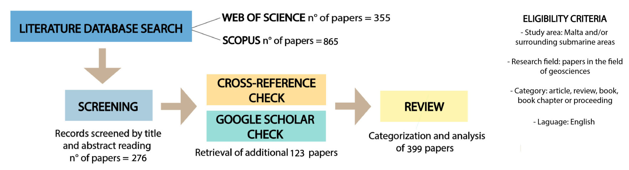 We considered papers with the following eligibility criteria: (i) focus on a study area including the Maltese Islands and/or the surrounding submarine regions, (ii) related to the geoscience field of research as defined by the search query mentioned below, (iii) fall into categories of articles, reviews, books, book chapters or proceedings, and (iv) to be published in English.