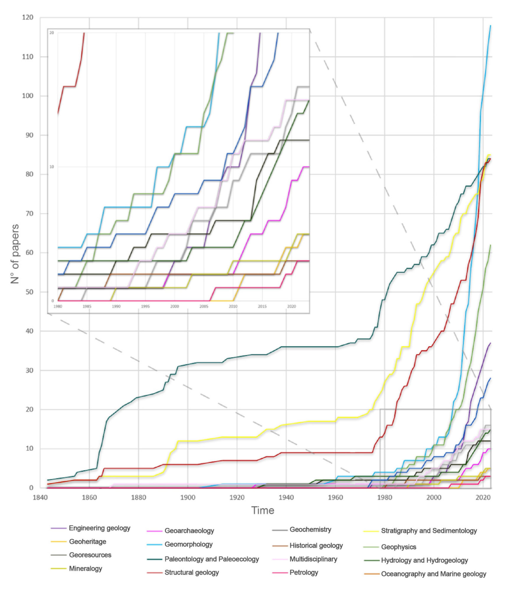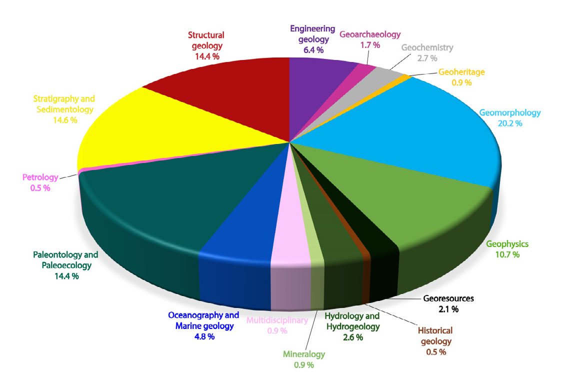 Our analysis reveals that 150 papers deal extensively with more than one geoscientific field (see Fig. 3). Geomorphology is the largest segment of the papers found, accounting for 20.2% showing an increased interest in this field in the last decade. The field of Stratigraphy and Sedimentology accounts for 14.6%, while Palaeontology and Palaeoecology, together with Structural geology, both account for 14.4% of the papers. Geophysics follows closely, with 10.7% of the total. Engineering geology represents the 6.4% of the papers. Oceanography and Marine geology account for 4.8% of the papers. The geoscientific fields of Geochemistry, Hydrology and Hydrogeology and Georesources contribute to 2.7%, 2.6% and 2.1% respectively to the total. The field of Geoarchaeology corresponds to 1.7% of the papers. Geoheritage, Mineralogy and Multidisciplinary share the low percentage of 0.9. However, the interest for geoheritage showed a remarkable increase in recent years. Historical geology and Petrology have a minimal presence, each representing 0.5% of the overall distribution.