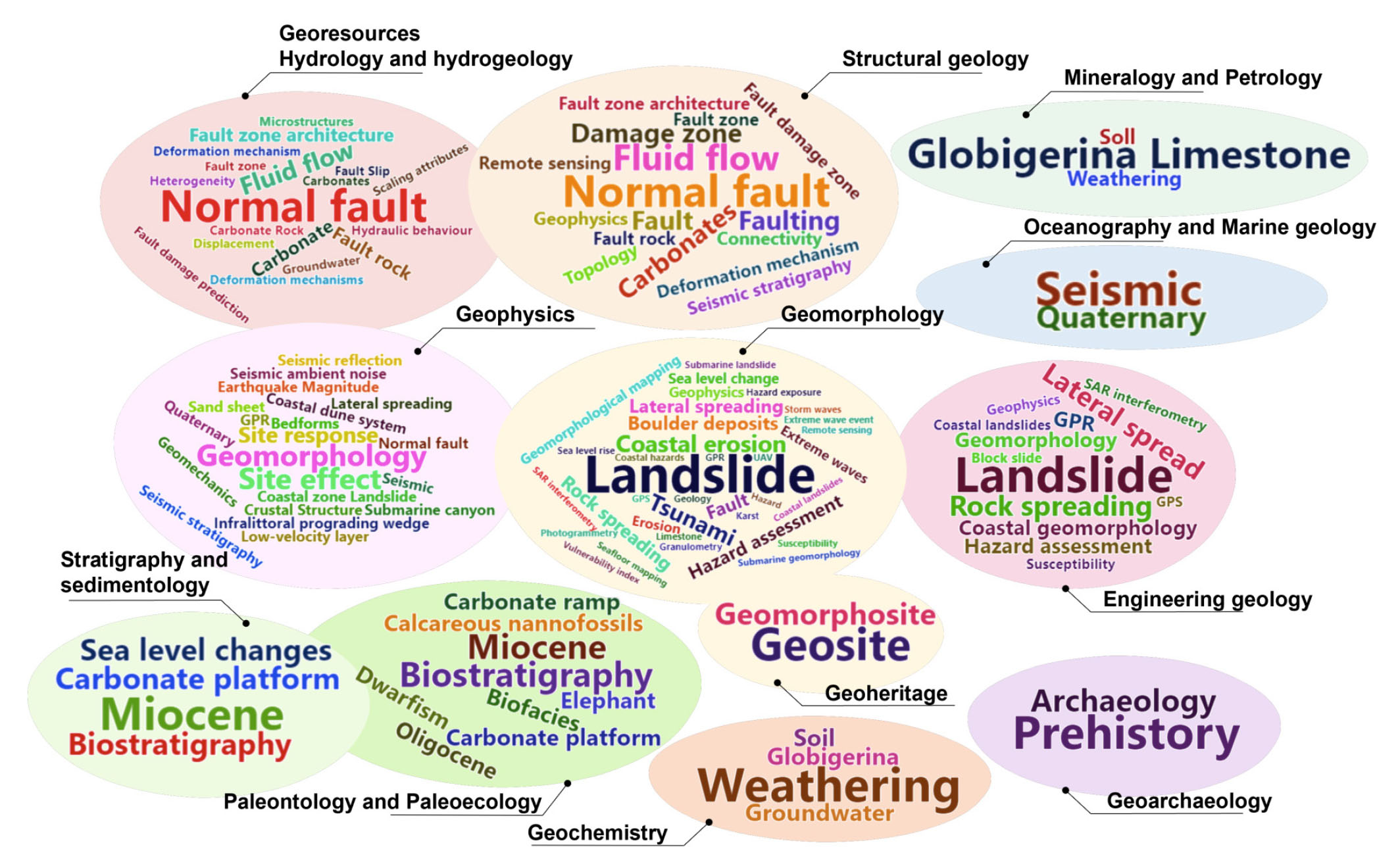From the world clouds (Fig. 5) it emerged that researchers in Engineering geology, Geomorphology, and Geophysics demonstrate a shared interest in coastal landforms and processes (e.g., Devoto et al., 2012, 2020; Prampolini et al., 2017; Galea et al., 2018; Rizzo et al., 2020, 2022; Vandelli et al., 2023). Research within these geoscientific fields focused on coastal landslides, namely on diffused rock spreads and block slides which were not mapped and monitored until 2008 (e.g., Magri et al., 2008; Devoto et al., 2020, 2021; Mantovani et al., 2022). A number of geomorphological studies focused on extreme wave events and related deposits (e.g., Causon Deguara & Scerri, 2019; Mottershead et al., 2020). Hydrology and Hydrogeology both contributed to the examination of fluid flow within normal faults affecting the carbonate rocks of the Maltese Islands (e.g., Micallef et al., 2011; Dimmen et al., 2017). Geochemical studies primarily focused on the weathering of the limestones (e.g., Cassar & Vella, 2003; Bianco, 2021; Roussel et al., 2021). Stratigraphy, sedimentology and palaeontology collaboratively investigated the Miocene sedimentary successions (e.g., Bianucci et al., 2011; Baldassini & Di Stefano, 2015; Scerri, 2019) and carbonate platforms (e.g., Brandano et al., 2019; Bialik et al., 2021; Gatt, 2022). Geoscientific research appeared extremely interconnected, highlighting the considerable potential for collaboration and interdisciplinary research, which are essential for deepening the understanding of complex geological phenomena.