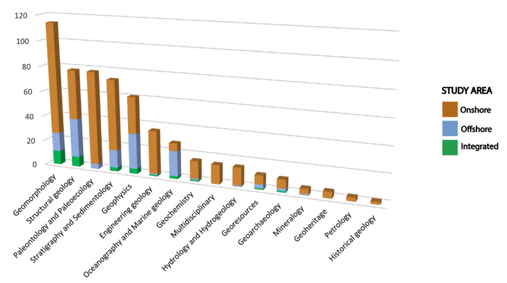 We then examined the distribution of these study areas with reference to the various geoscientific fields, as illustrated in Fig. 6. Research on the Maltese Islands focus on onshore study areas, with the exception of Oceanography and Marine geology. Structural geology and Geophysics are the only ones where the number of papers on onshore and offshore study areas is almost equal. Meanwhile, Multidisciplinary, Geoheritage, Petrology and Historical geology refer exclusively to onshore regions. Palaeontology and Palaeoecology, Hydrology and Hydrogeology, and Mineralogy deal exclusively with onshore and offshore areas, and no evidence of integrated terrestrial and marine data was observed. The field of Geomorphology presents the largest number of papers integrating terrestrial and marine datasets.