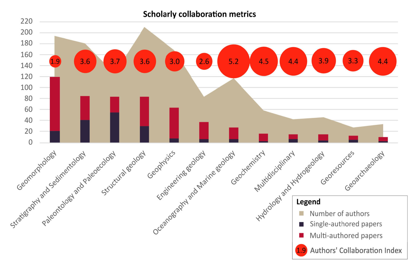 Examining Table 1 and Fig. 7, and focusing on geoscience fields with a total number of articles ≥ 10, which ensures the most representative indices, significant insights emerge. Geomorphology is the geoscientific field with the highest number of publications (119), frequent collaborations (98) and the lowest Authors’ Collaboration Index (1.9). Geoarchaeology has the lowest number of publications (10), shared with Geochemistry for single-author articles (3) and Georesources for multi-author articles (7). The geoscience field of Georesources, with the lowest number of authors (27), contrasts with Structural geology, on which most authors focused (210). Palaeontology and Palaeoecology stand out with the highest number of publications per single author (55). The field of Oceanography and marine geology has the highest Authors’ Collaboration Index (5.2).