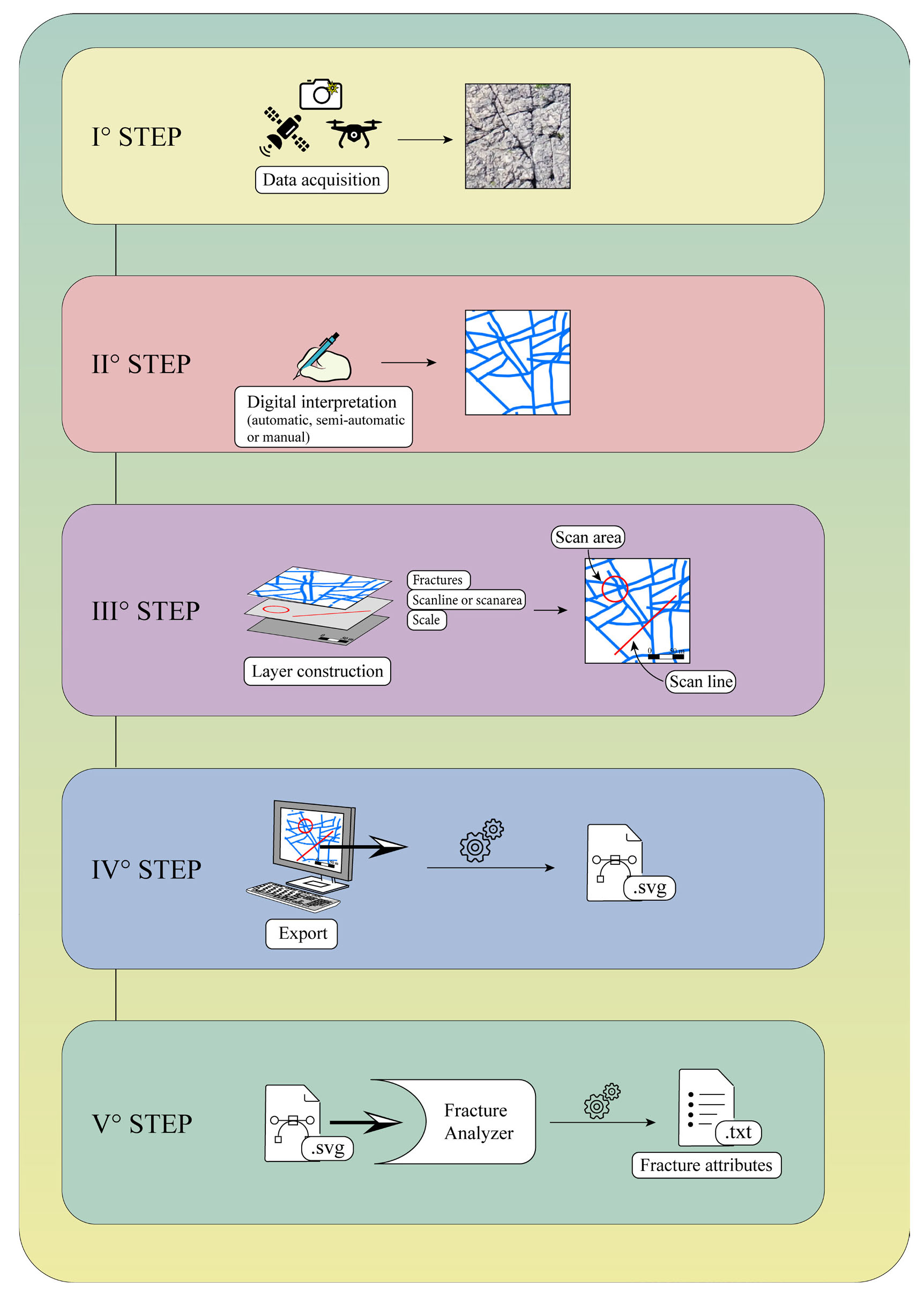 The acquisition of fractures to be processed with FA can be performed by using the methodology chosen by the user: automatic, semi-automatic, or manual. It’s important to note that the accuracy and quality of the dataset directly impact the precision of FA output results. In this work, fractures were digitised manually through Adobe Illustrator for greater accuracy.