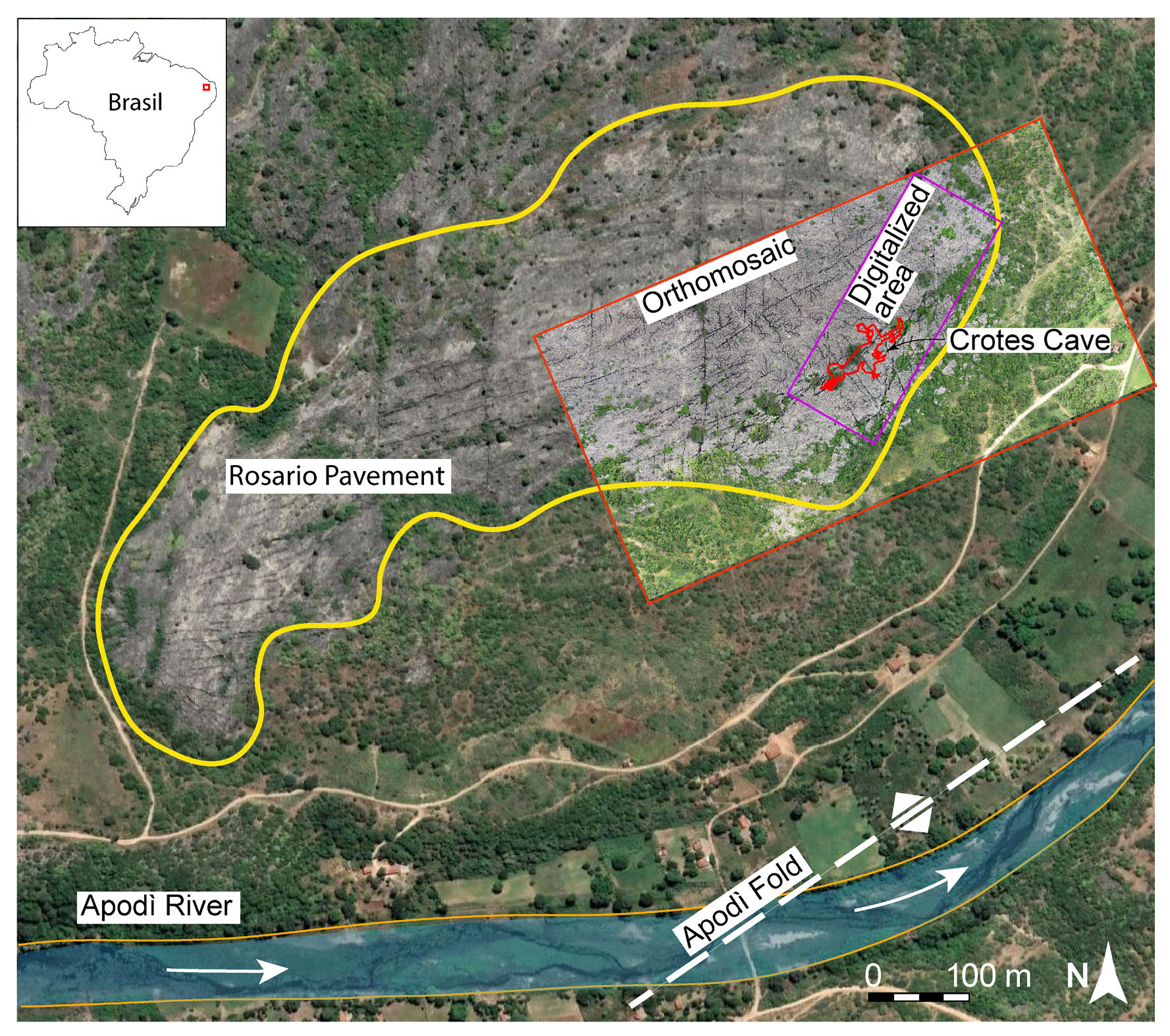 - Satellite view of the Rosario outcrop, where the yellow line outlines the study area, the red line is the high-resolution orthomosaic, and the purple line is the digitised area with the Crotes cave in red.