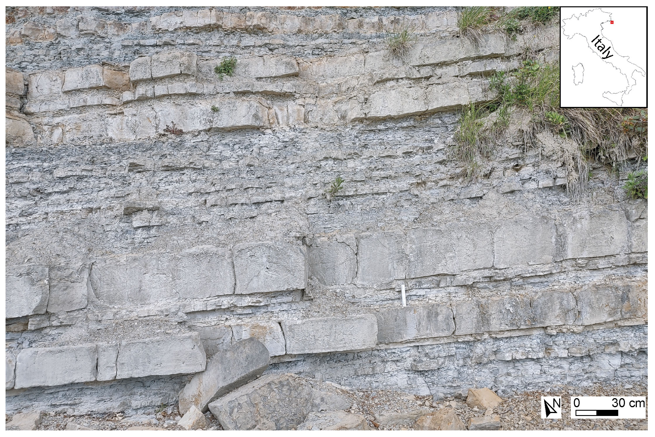 - Muggia sub-vertical outcrop where well-exposed fractures can be seen in the thicker layers.