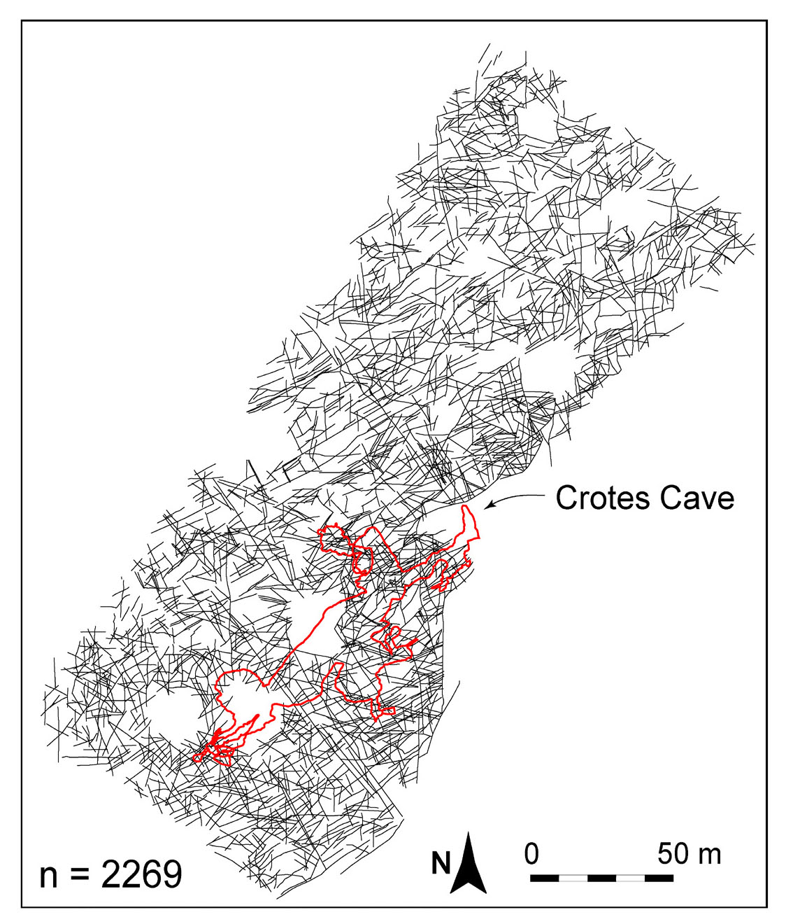 - Dataset of digitised fractures on Rosario outcrop in black and Crotes cave in red.