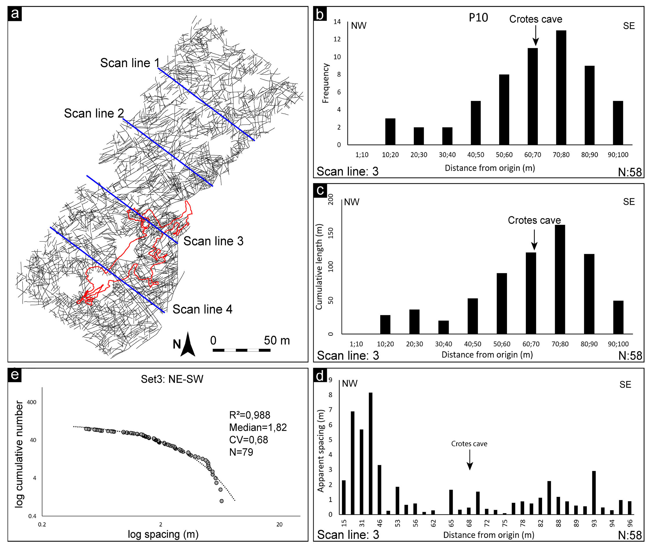 - Dataset of Rosario pavement and scanlines (a). Scanline 3 plots of P10 (b), cumulative length for unit length (c), and apparent spacing vs. distance (d). NE-SW fracture set attributes and relative log cumulative fractures vs log spacing plot (e).