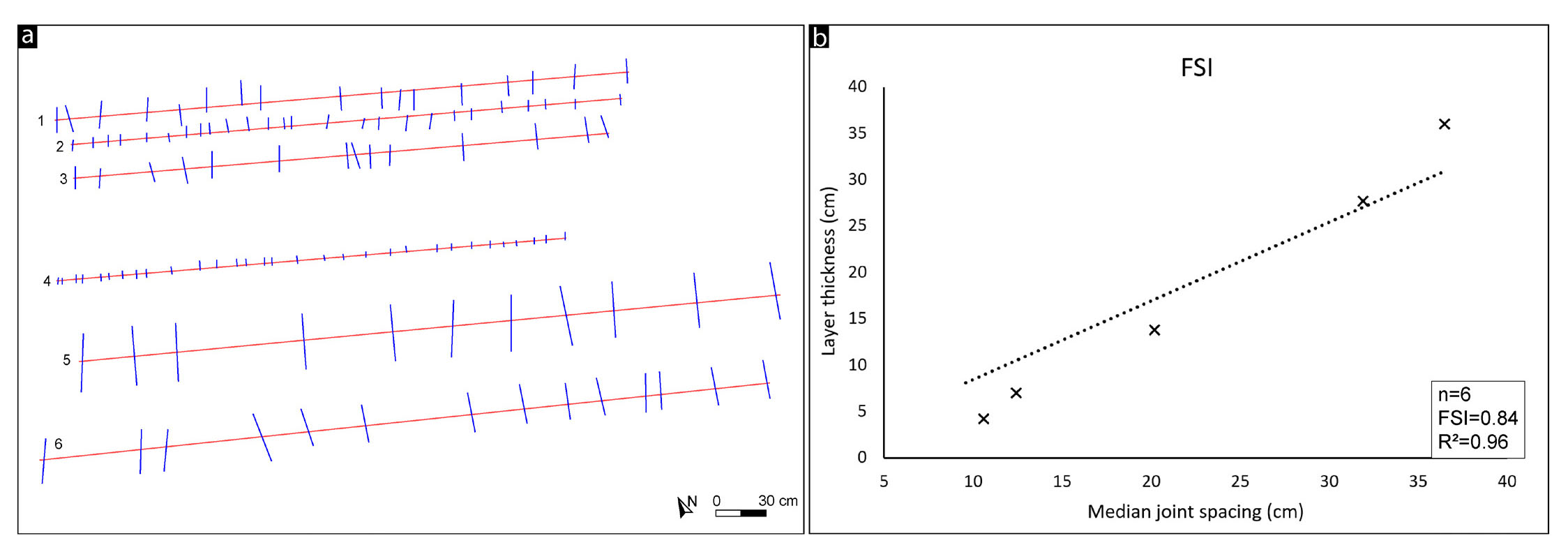 - Muggia fractures dataset, where the blue lines are the fractures and the red lines are the scanlines (a); FSI (Fracture Spacing Index) plot, where the crosses are the FSR (Fracture Spacing Ratio) value for the scanlines (b).
