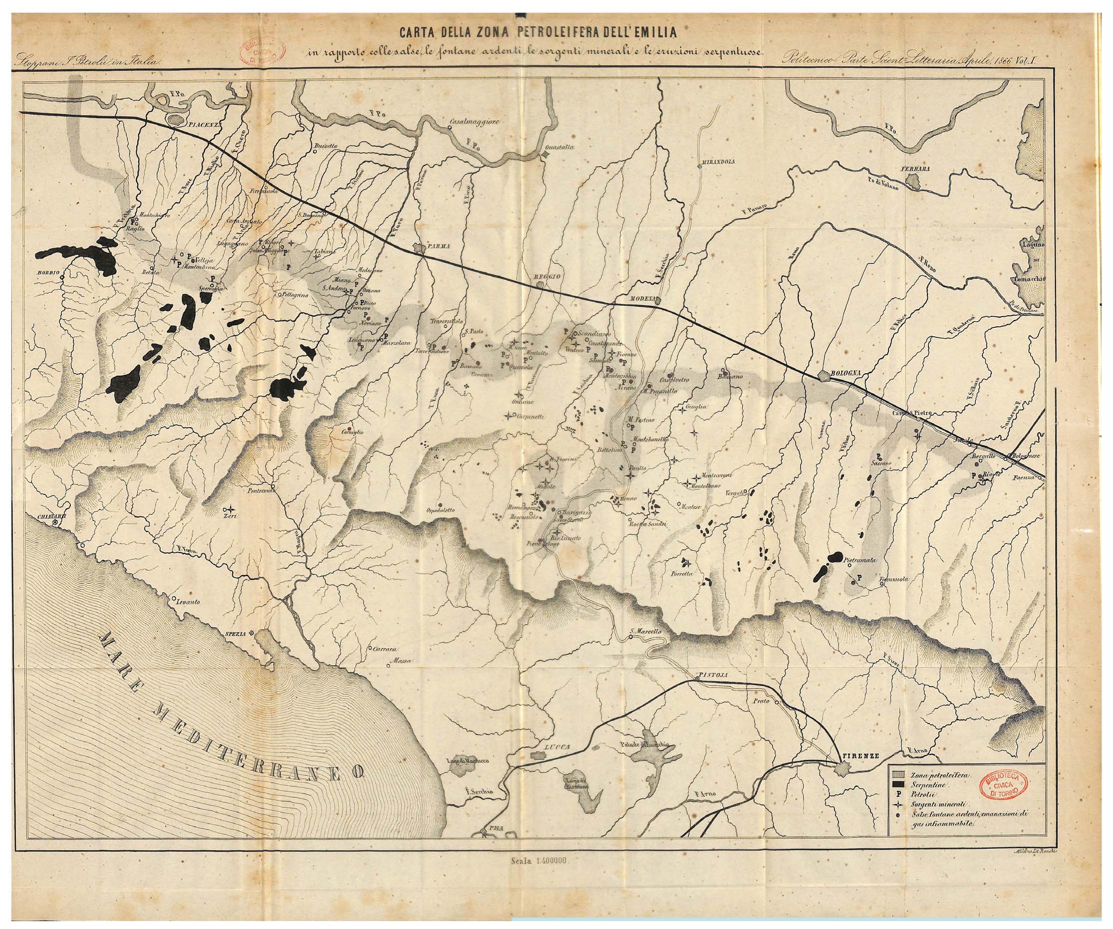 - Map of the petroleum zones of Emilia. Gray shaded areas indicate the geologic trend of petroleum zones and black spots are the principal outcrops of ophiolitic rocks. The map also locates oil springs, active oil wells, mineral springs, mud volcanoes, and gas seepages (Stoppani, 1866).