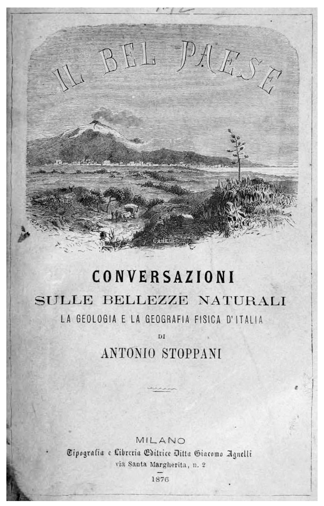- Book cover of the first edition of Il Bel Paese (1876); the drawing, made by the famous engraver Francesco Canedi, depicts Mount Etna seen from Catania. Public domain, https://commons.wikimedia.org/w/index.php?curid=82416359.