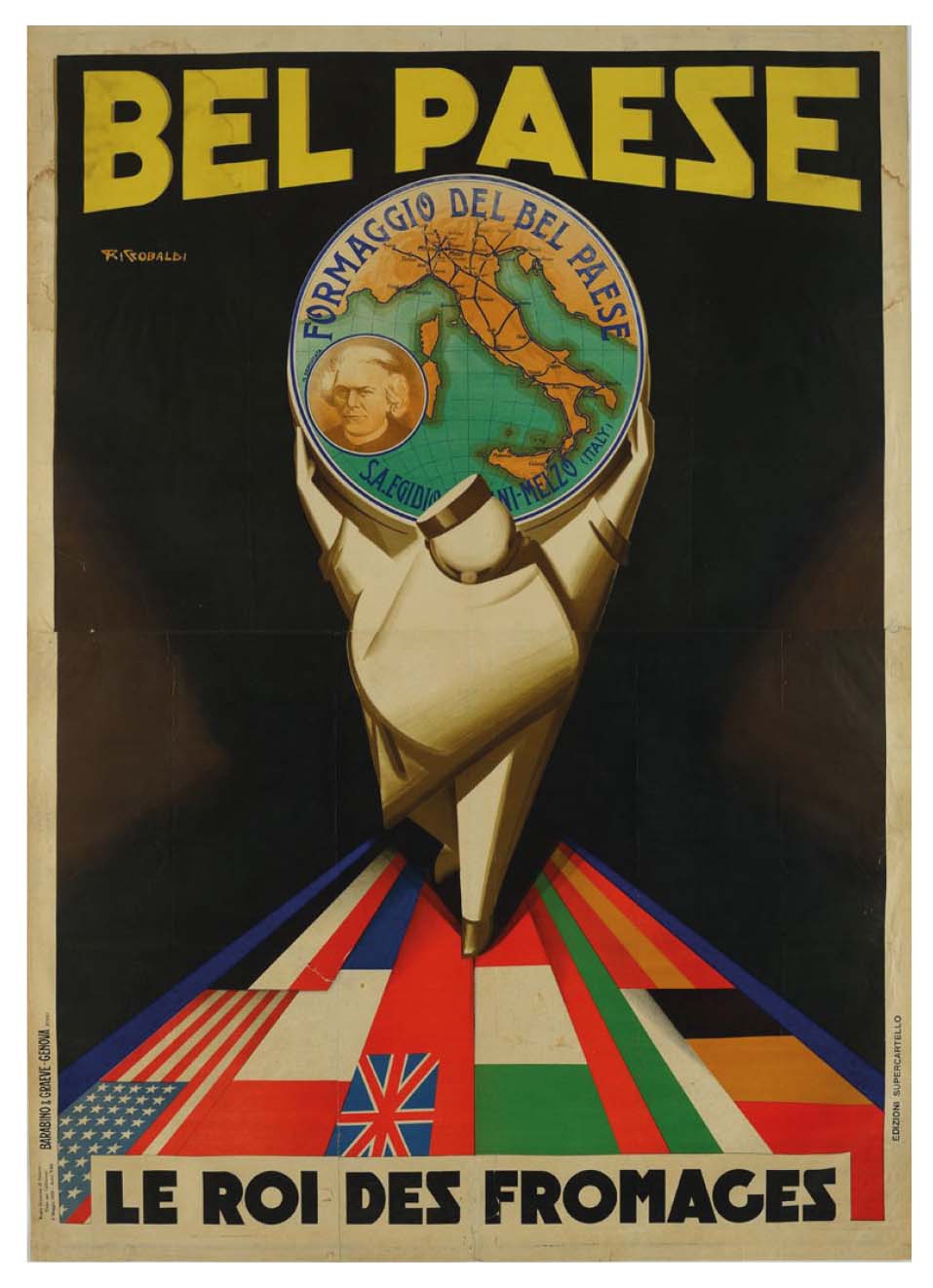 - A stylized delivery boy walks on a carpet of flags carrying on his shoulder a wheel of Bel Paese, “the king of cheeses”. The round cheese label displays a map of the main Italian railways of the early 20th century and the classic portrait of Stoppani normally used in the frontispiece of his best seller. Advertising poster by Giuseppe Riccobaldi Del Bava, before 1930. Public domain, https://catalogo.beniculturali.it/detail/HistoricOrArtisticProperty/0500674613.