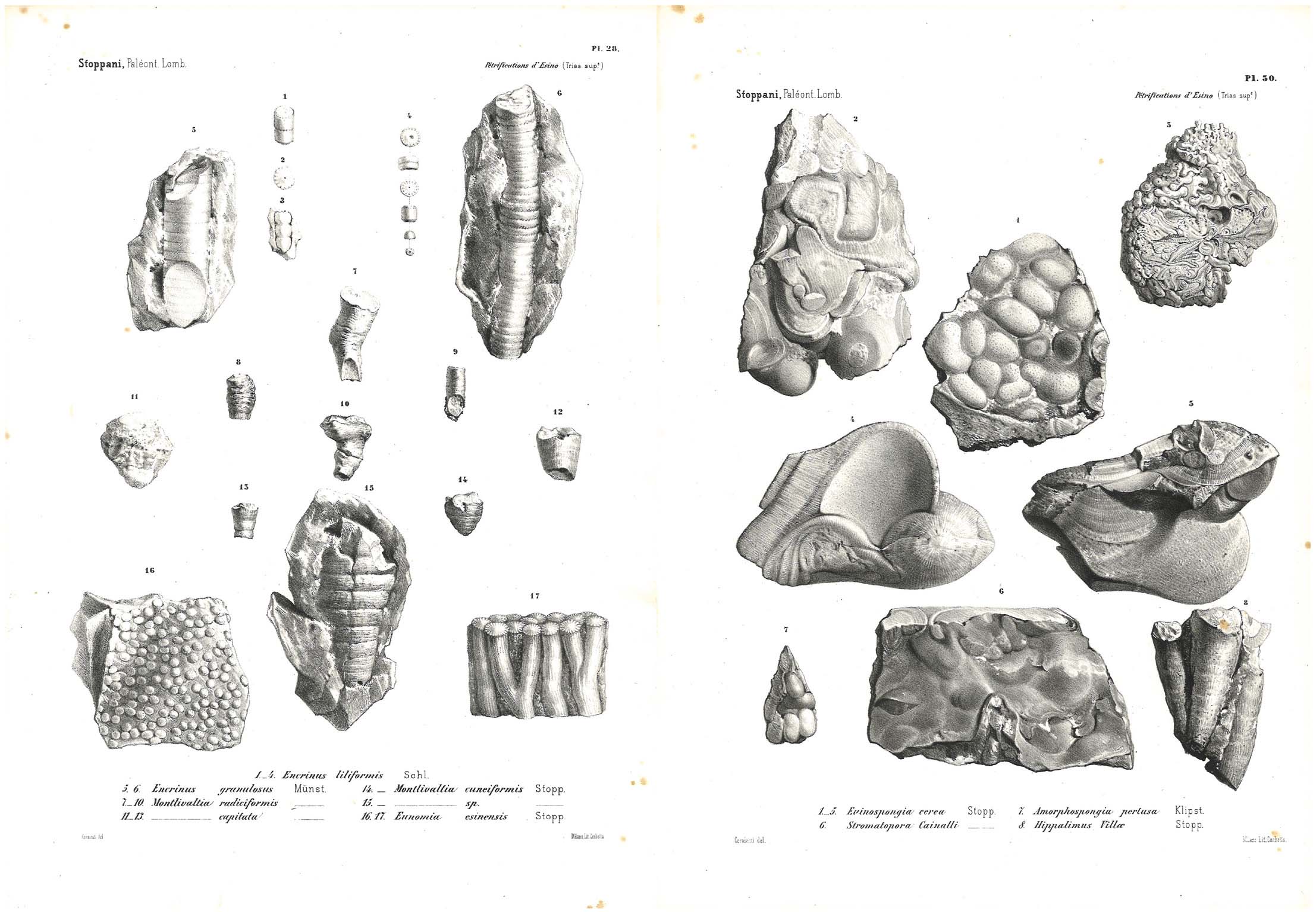 - Palaeontological plates from the Volume I - Les pétrifications d’Ésino, ou Description des fossiles appartenant au dépôt triasique supérieur des environs d’Ésino en Lombardie - of the series Paléontologie Lombarde ou description des fossiles de Lombardie. Courtesy ISPRA Library. On the left: crinoids (Encrinus liliformis and Encrinus granulosus) and corals (Montlivaltia sp. and Eunomia esinensis). On the right: Evinospongia cerea Stopp., Stromatopora Cainalli, Amorphospongia pertusa and Hippalimus villae Stopp. It is noteworthy that Evinospongia cerea, previously assigned by Stoppani to the Spongiidae family, has been reinterpreted as a product of palaeokarst.