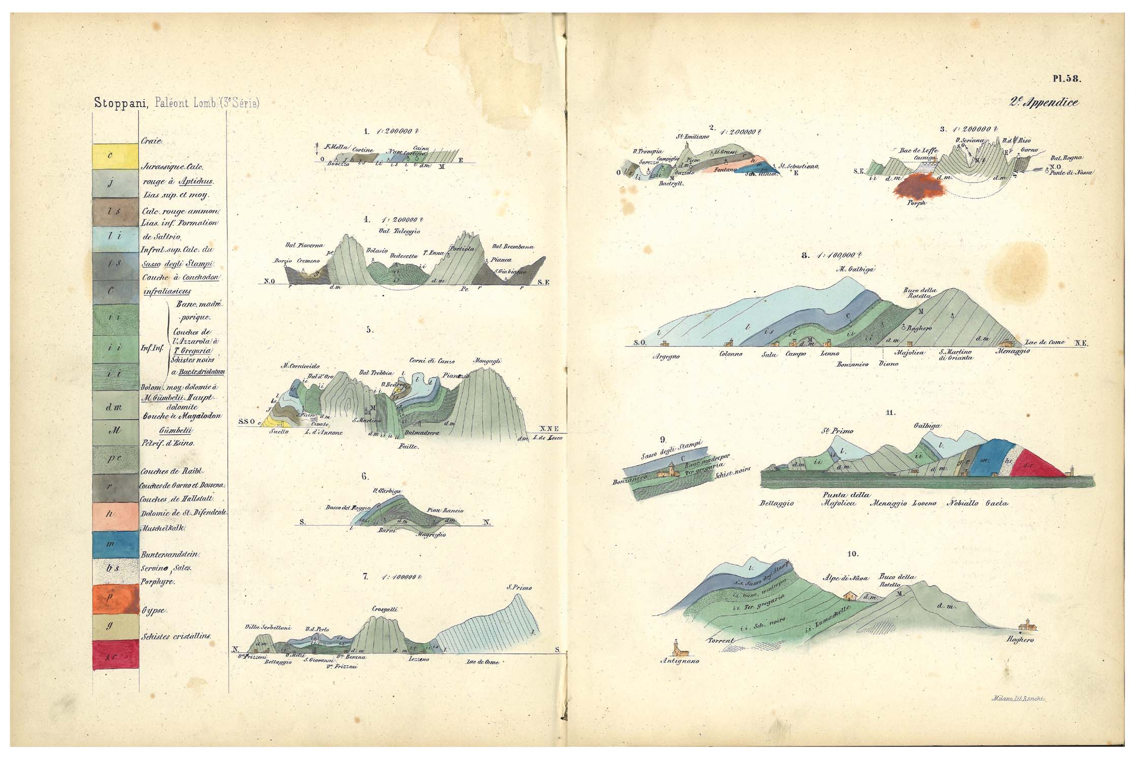- Stratigraphic scheme and geological cross-sections contained in the volume Géologie et paleontologie des couches a Avicula contorta en Lombardie (Stoppani, 1858-60b). Worth of note is the watercolouring of the plate. Courtesy ISPRA Library.