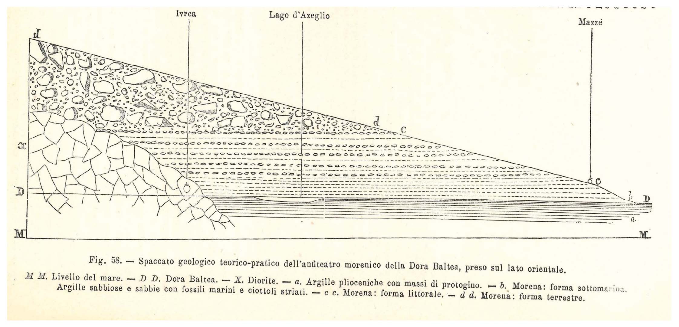 - Theoretical and practical geological cross-section of the Dora Baltea moraine amphitheater, taken from the eastern side. M-M: Sea level; D-D: Dora Baltea river; X: Diorite; a: Pliocene clays with protogine boulders; b: Moraine: submarine form. Clayey sands and sands with marine fossils and striated pebbles; c-c: Moraine: littoral form; d-d: Moraine: terrestrial form (from Stoppani, 1877). Courtesy ISPRA Library.