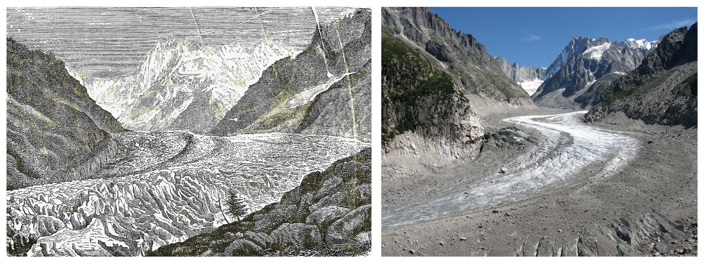 - On the left: “La Mer de glace a Chamouny” (Stoppani, 1880). Courtesy ISPRA Library. On the right: Mer de Glace, August 6, 2009 (SNappa2006, https://www.flickr.com/people/snappa2006/, CC BY 2.0).