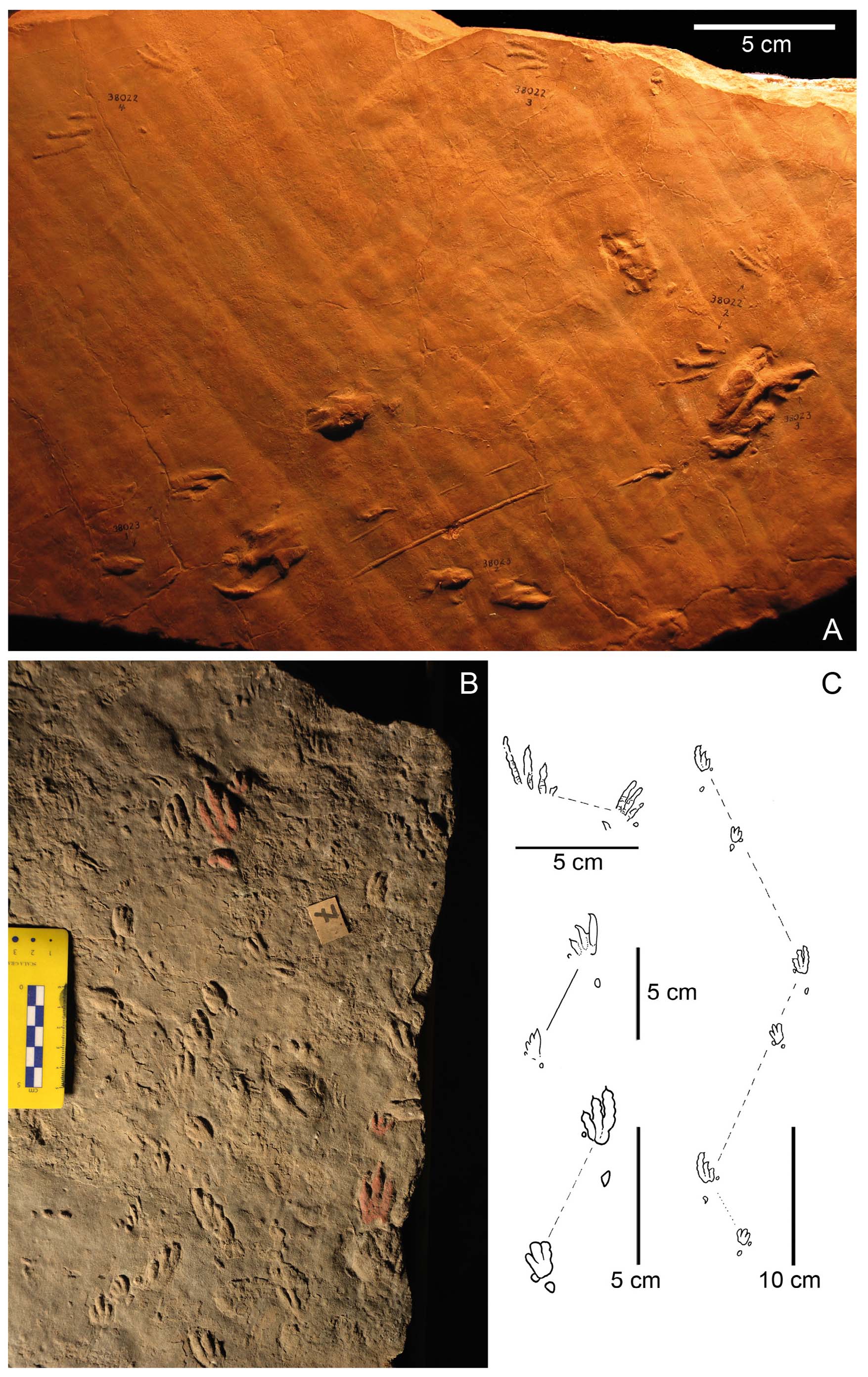 - Rotodactylus (dinosauromorph) footprints and trackways from Middle Triassic deposits. A. Rotodactylus cursorius (R. “mckeei”) from upper red formation (Moenkopi Group, Middle Triassic, Anisian) of Utah (from Klein and Lucas, 2010b). B. R. matthesi with Chirotherium sickleri (red colour) from Solling Formation (Buntsandstein, Middle Triassic, Anisian) of Thuringia, Germany. C. Interpretive sketches of R. cursorius (top left and centre left) and R. matthesi (bottom left and right) (from Peabody, 1948; Haubold, 1971b).