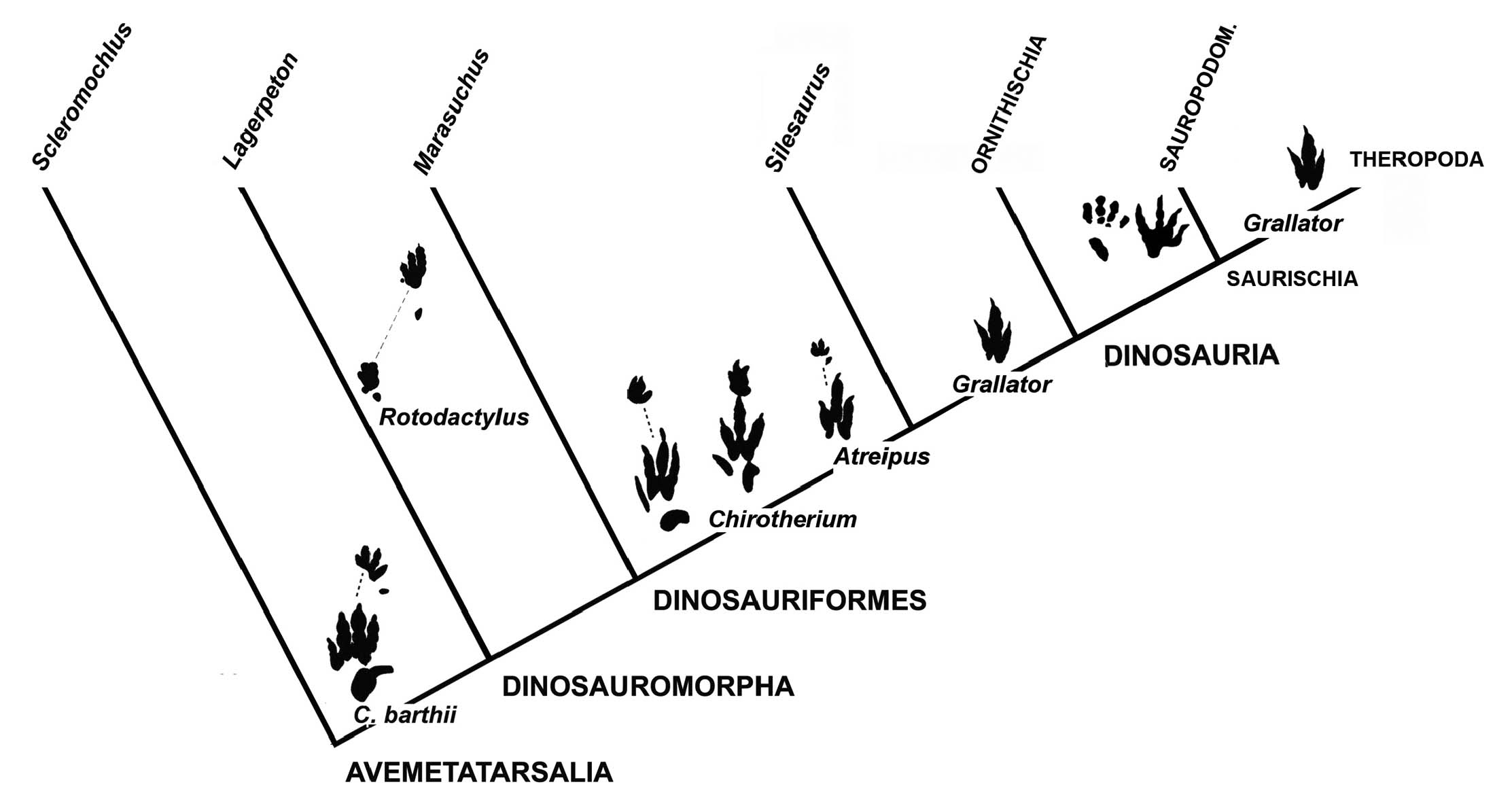 - Cladogram with phylogenetic relationships of Avemetatarsalia-Dinosauria with hypothetical position of archosaur tracks treated in this paper.