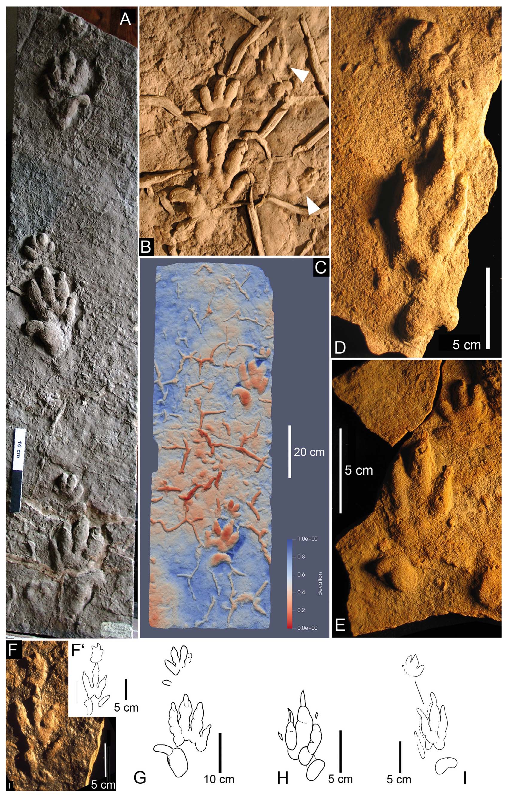 - Chirotherium footprints and trackways from the Middle Triassic. A-C. C. barthii from type surface in the Solling Formation (Thüringischer Chirotheriensandstein, Middle Triassic, Anisian) of Hildburghausen, Germany as photographs (A-B) and false colour depth model (C). D-E. Chirotherium (“Sphingopus”) ferox from Eschenbach Formation (Muschelkalk, Middle Triassic, Anisian) of Germany. F, F’ Chirotherium (“Parachirotherium” postchirotherioides) from Benk Formation (Middle Triassic, Ladinian) of Germany as photograph and interpretive sketch. G-I. Interpretive sketches of Chirotherium from Middle Triassic deposits. G. C. barthii from Germany, H. C. ferox (holotype of Sphingopus ferox) from France. I. C. ferox from Germany. A-B. Courtesy H. Haubold. C. Courtesy Jens N. Lallensack. D-I. From Klein & Lucas, 2018, 2021).