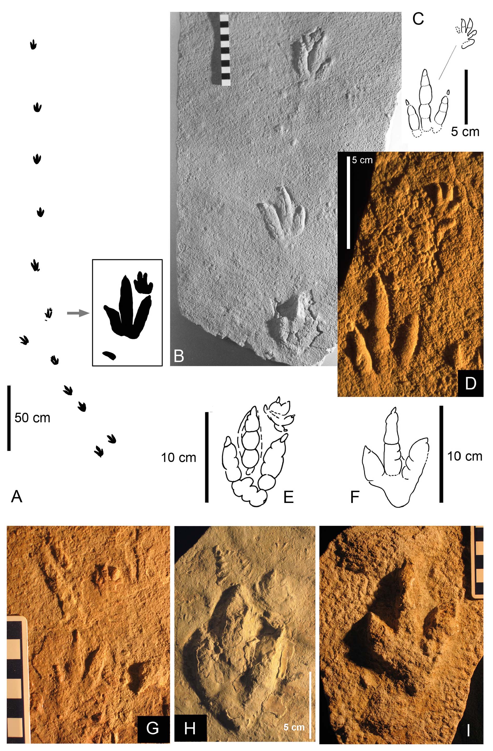 - Functionally tridactyl mesaxonic footprints from the Middle Triassic, possibly left by facultative bipeds, as photographs and interpretive sketches. A-D. Atreipus-Grallator (“Coelurosaurichnus”) from Benk Formation (Middle Triassic, Ladinian) of Germany. E-I. Atreipus-Grallator (“Coelurosaurichnus”) From the Middle Triassic of France. All from Klein & Lucas (2021).