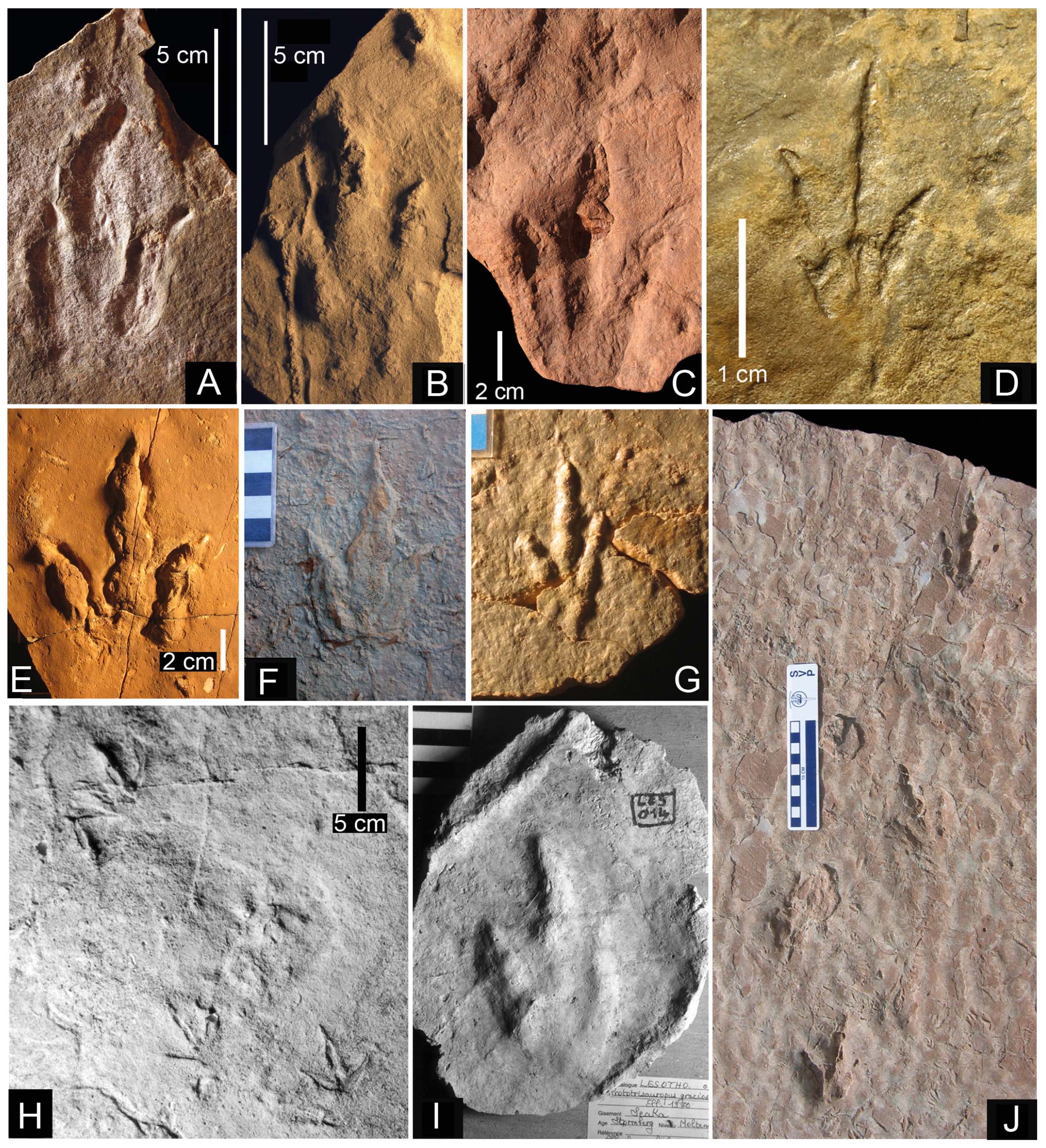 - Mesaxonic tridactyl footprints from the Late Triassic. A-B. Atreipus from Hassberge Formation (Coburger Sandstein, Carnian) of Germany. C. Atreipus from Bigoudine Formation (T6, ?Norian) of the Argana Basin, Morocco. D. Banisterobates from Dry Fork Formation (Carnian) of Virginia, USA. E-F. Grallator from Redonda Formation, Chinle Group (Norian-Rhaetian), New Mexico, USA. G. Small (?juvenile) Grallator from Hassberge Formation (Coburger Sandstein, Carnian) of Germany. H-I. Bird-like footprints Trisauropodiscus and Grallator from Lower Elliot Formation (Norian) of Lesotho, southern Africa. J. Grallator from Redonda Formation (Norian-Rhaetian) of New Mexico, USA. From Klein & Lucas (2021).