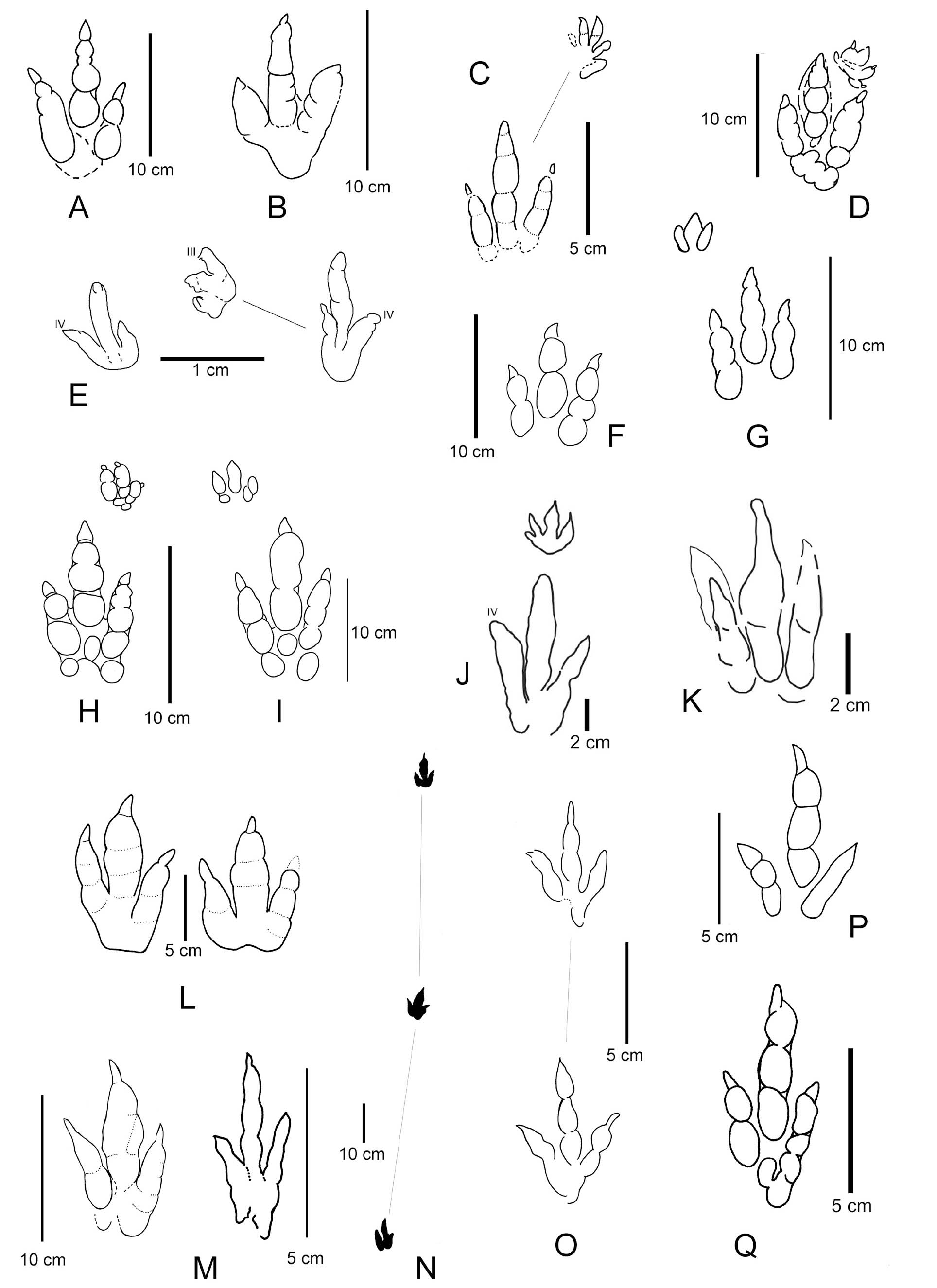 - Large theropod footprints from the Triassic as sketches. A, Pengxianpus cifengensis from Xujiahe Fm. (Late Triassic) of Sichuan Province, China. B-O. Anchisauripus-Eubrontes. B, From Lower Elliot Fm. (Norian) of Lesotho, Southern Africa. C, From Höganäs Fm. (Late Triassic, Rhaetian) of southern Sweden. D, From Lower Elliot Fm. (Norian) of Lesotho, Southern Africa. E-F, From Timezgadiouine Fm. (T5, Carnian) of the Argana Basin, Morocco. G, From Late Triassic (Carnian) of the Southern Alps. H, From Late Triassic (Norian) of southern France. I, From Tomanová Fm. (?Late Norian-Rhaetian) of Slovakia. J, From Caturrita Fm. (Early Jurassic of Brazil. K, From Tomanová Fm. (?Late Norian Rhaetian) of Slovakia. L, From Early Jurassic (Hettangian) of northern Bavaria, Germany. M, From Late Triassic (Norian) of southern France. N-O, Eubrontes giganteus from Early Jurassic of Newark Supergroup, North America (O = type). P, Anchisauripus sillimani (type) from Early Jurassic of Newark Supergroup, North America. Sketches from Ellenberger et al. (1970), Haubold (1971b, 1984), Gierliński & Ahlberg (1994), Olsen et al. (1998), Gand et al. (2000), Lucas et al. (2006), Klein & Haubold (2007), Niedźwiedzki (2011), Lagnaoui et al. (2012), Silva et al. (2012), Bernardi et al. (2013) and Xing et al. (2013).