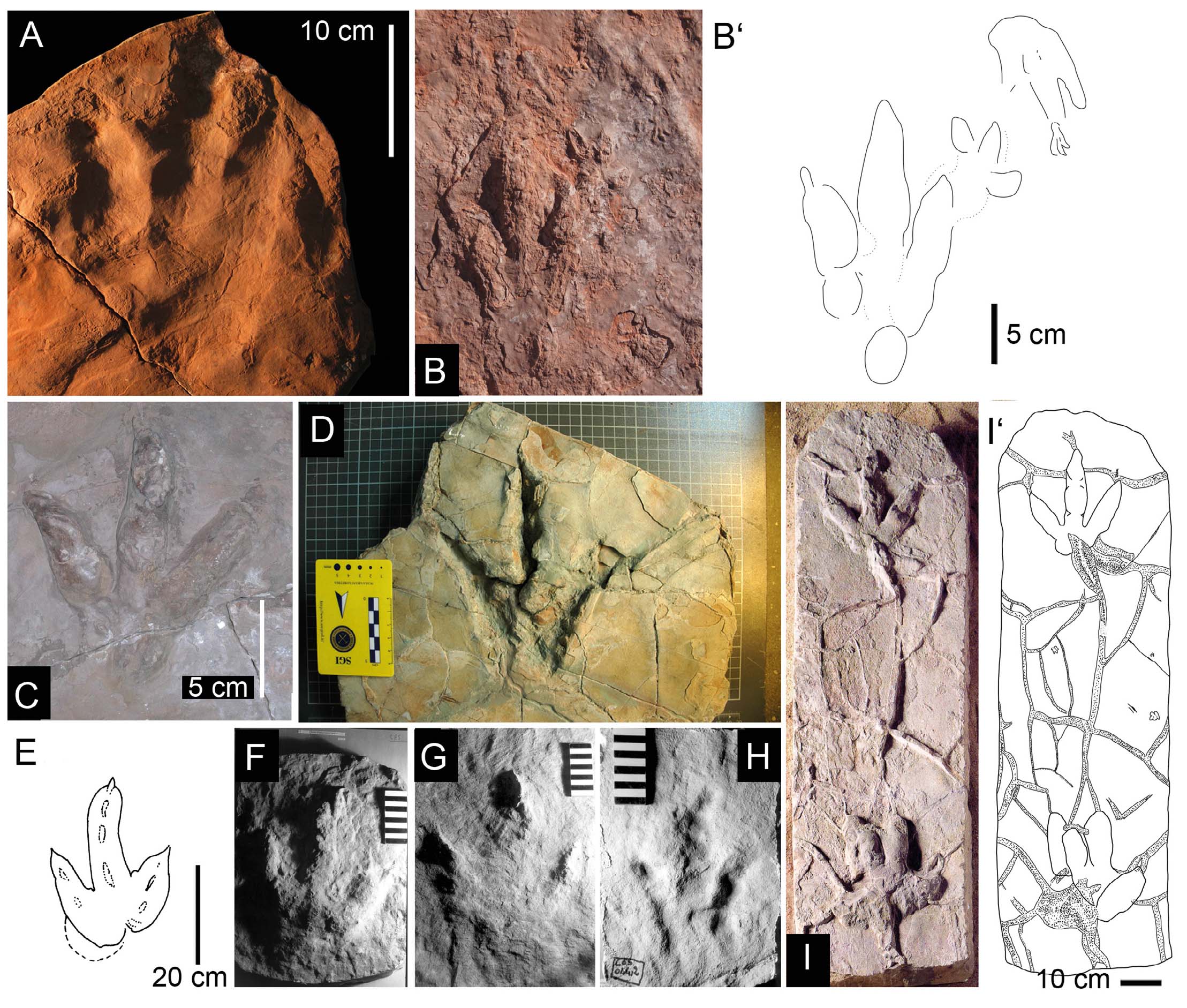 - Large Eubrontes-size tridactyl footprints from the Late Triassic as photographs and interpretive sketches. A-B, B‘. Eubrontes isp. and Atreipus-Grallator-Eubrontes plexus form from Timezgadiouine Formation (T5, Carnian) of the Argana Basin, Morocco (B-B‘ with associated manus imprint). C-D. Grallator-Anchisauripus-Eubrontes plexus footprint from Ørsted Dal Formation of Fleming Fjord Group, Eastern Greenland. E-H. Grallator-Anchisauripus-Eubrontes plexus footprints from Lower Elliot Formation (Norian) of Lesotho, southern Africa as interpretive sketch and photographs. I-I‘ Pengxianpus xifengensis (Holotype) from Xujiahe Formation (Norian-Rhaetian) of Sichuan Province, China. From Lagnaoui et al. (2012), Zouheir et al. (2020), Klein & Lucas (2021), Ellenberger (1972), Xing et al. (2013), Klein & Lucas (2021).