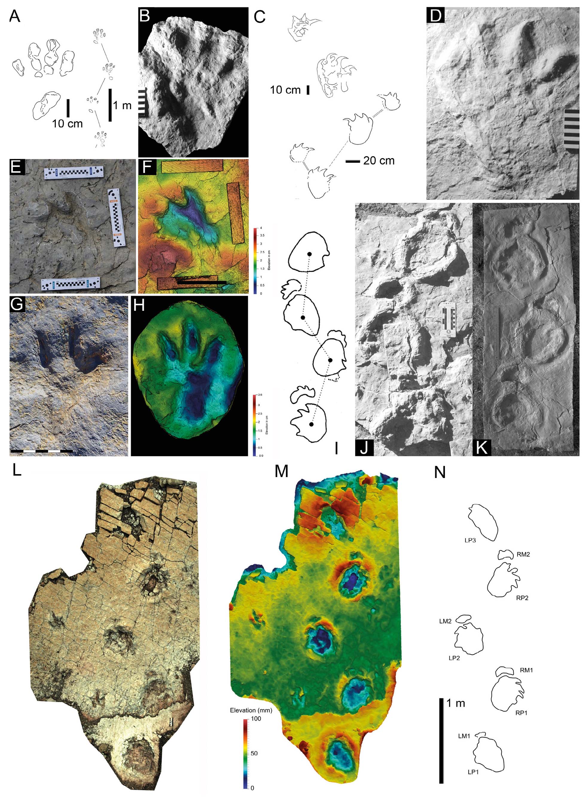 - Triassic sauropodomorph footprints. A-B. Pseudotetrasauropus bipedoida (Holotype) from Lower Elliot Formation of Lesotho, southern Africa as interpretive sketch and photograph of plaster cast. C-D. Tetrasauropus unguiferus (Holotype) as interpretive sketch and photograph from same unit and locality as A-B. E-H. Pseudotetrasauropus from Hauptdolomit Formation (Norian) of Graubünden, Swiss Alps as photographs and false colour depth and contour line models. I-K. Eosauropus cimarronensis from Sloan Canyon Formation (Chinle Group, Late Triassic) of New Mexico USA. L-N. Eosauropus isp. from Ørsted Dal Formation of Fleming Fjord Group in Eastern Greenland as false colour depth models and automated outline sketch. From D’Orazi Porchetti & Nicosia, 2007; Meyer et al. (2022); Lockley et al. (2006); Klein & Lucas, 2021; Lallensack et al. (2017).