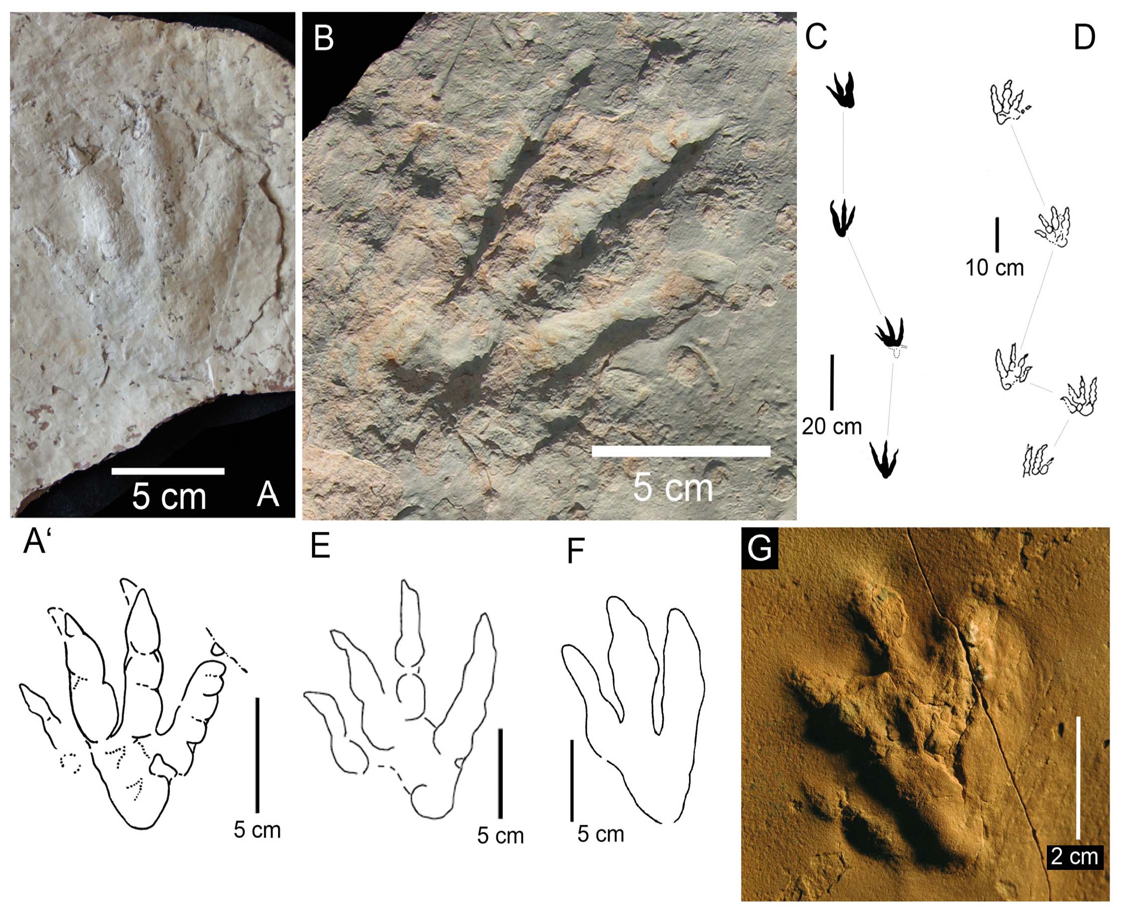 -Triassic sauropodomorph footprints Evazoum. A, A’. E. sirigui plaster cast of holotype from Montemarcello Formation (Carnian) of Italy in the collection of the Earth Science Department, University of Rome. B-F. E. sirigui from Redonda Formation (Chinle Group, Norian-Rhaetian) of New Mexico, USA. G. Possible small (?juvenile) Evazoum from Timezgadiouine Formation (T5) of the Argana Basin, Morocco. From Lucas et al. (2010), Klein & Lucas (2021), Lagnaoui et al. (2012).