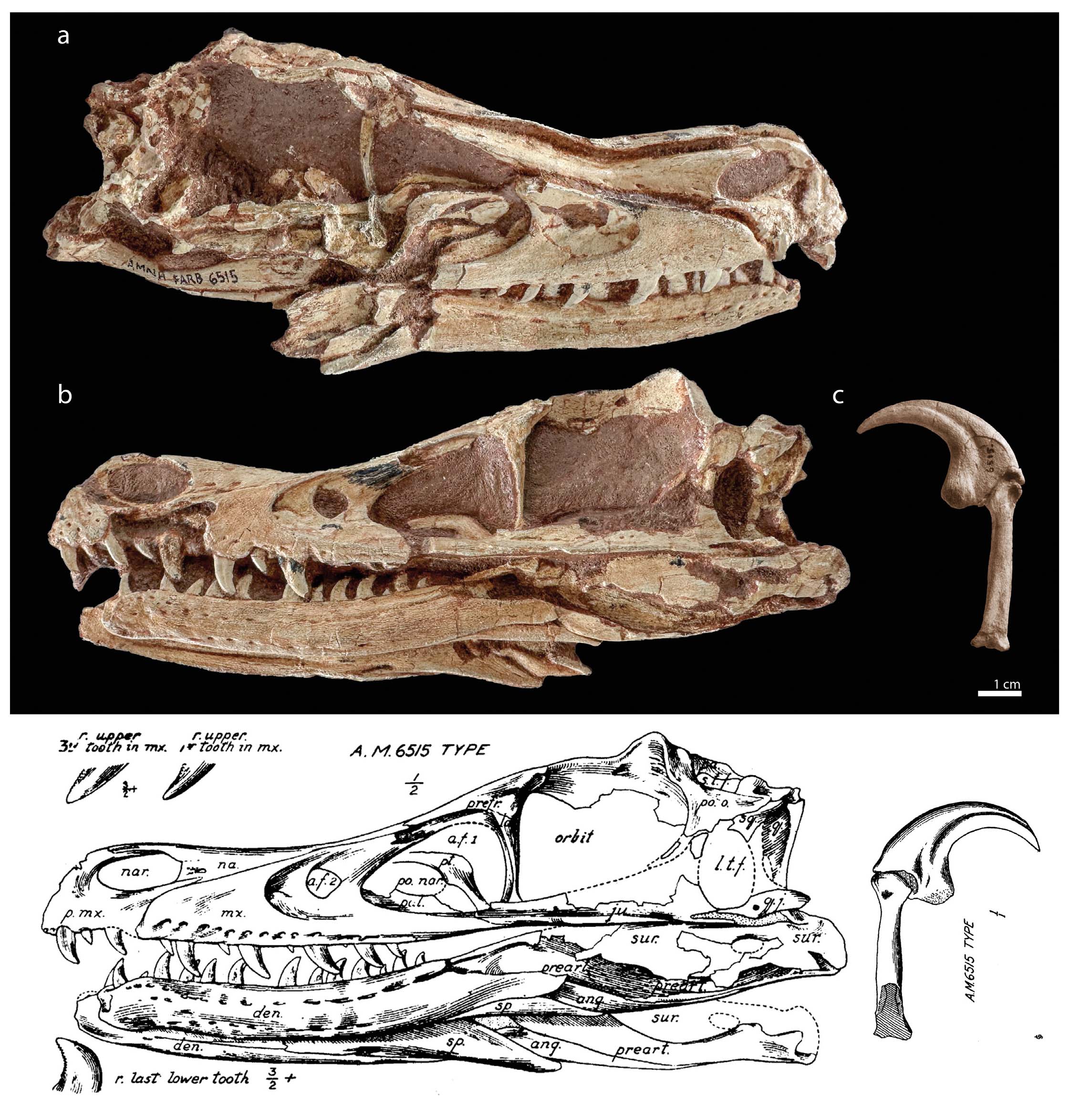 - Skull of AMNH 6515 in right lateral view (a), left lateral side (b) and original drawings by Osborn (1924) (d). Manus claw articulated with the penultimate phalanx from digit III of AMNH 6515 (c).