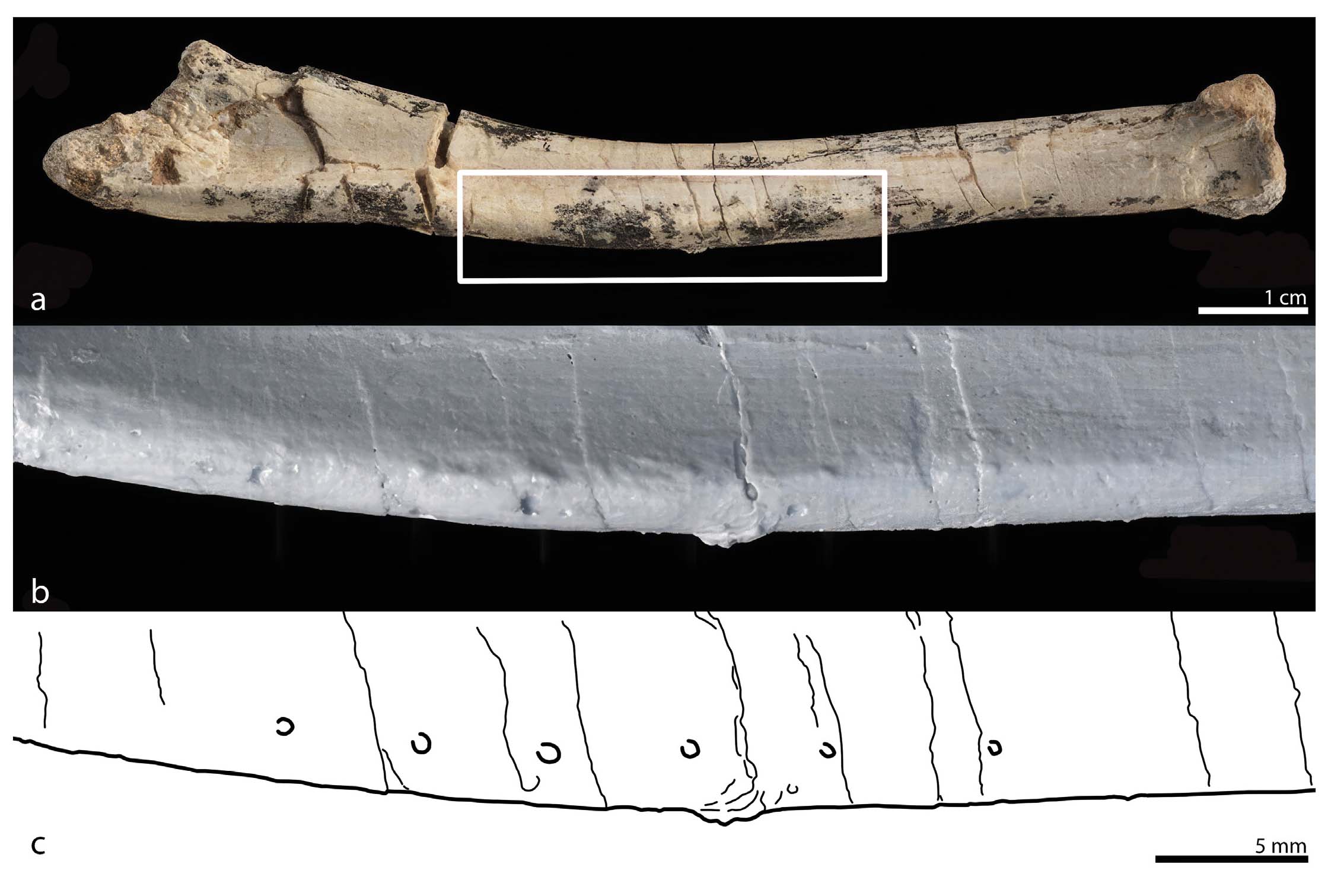 - (a) Dorsal view of right ulna of Velociraptor MPC-D 100/981. (b) Detail of the white box in (a) showing six evenly spaced feather quill knobs highlighted in the line drawing in (c). (a) and (b) are modified from Turner et al. (2007).