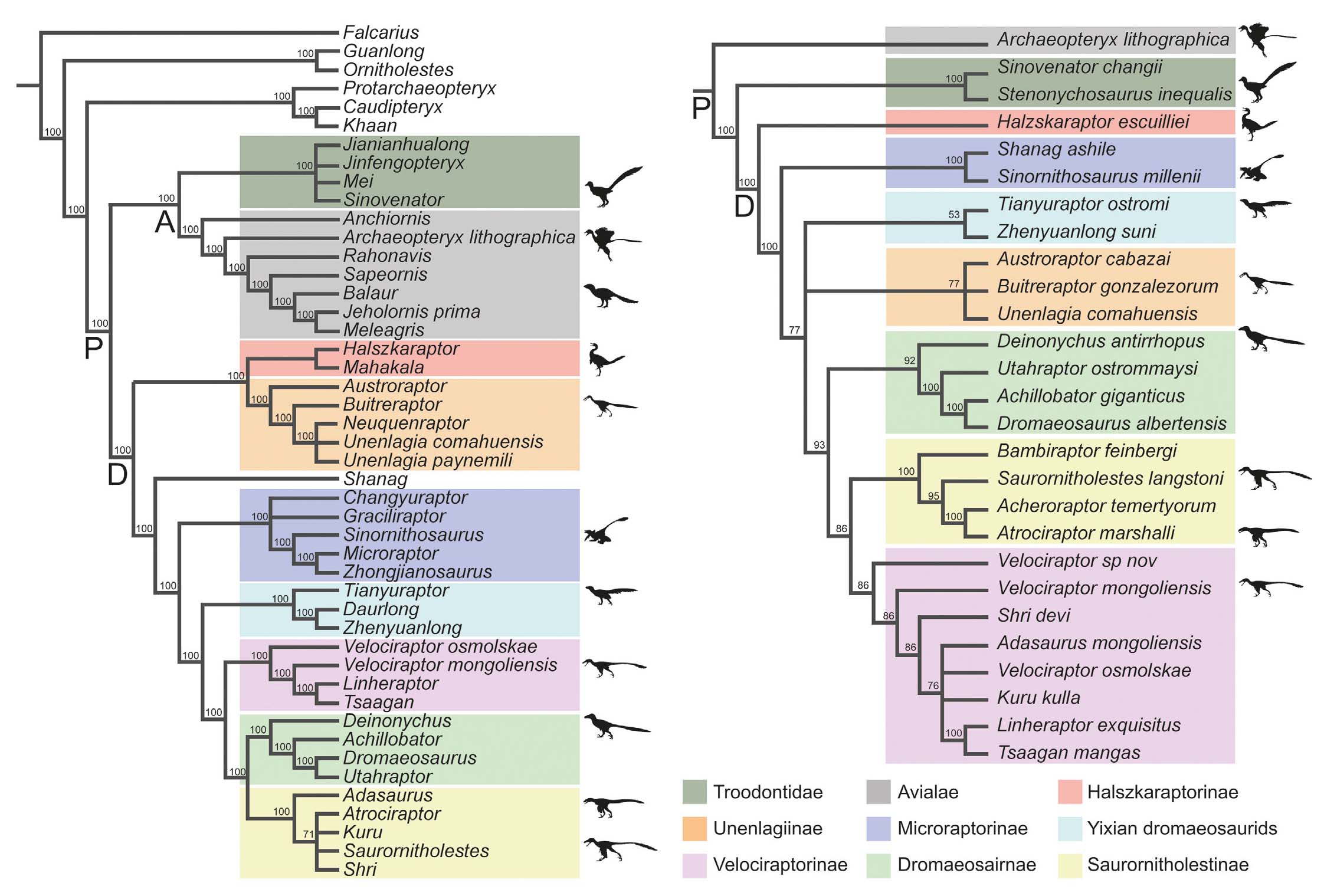 The three clades Velociraptorinae, Dromaeosaurinae, and Saurornitholestinae belong to Eudromaeosauria, first recovered and defined by Longrich & Currie (2009) as the most inclusive clade containing Dromaeosaurus, Velociraptor, Deinonychus, and Saurornitholestes, their most recent common ancestors and all its descendants. Dromaeosaurinae and Velociraptorinae are often recovered as sister clade, with Saurornitholestinae forming a basally branching radiation within Eudromaeosauria (Longrich & Currie, 2009; Evans et al., 2013; Powers et al., 2020; Napoli et al., 2021; Turner et al., 2021); conversely, in other analyses, Velociraptorinae is sister to Saurornitholestinae, with Dromaeosaurinae being a basal clade of Eudromaeosauria (Powers et al., 2021a; Wang et al., 2022).