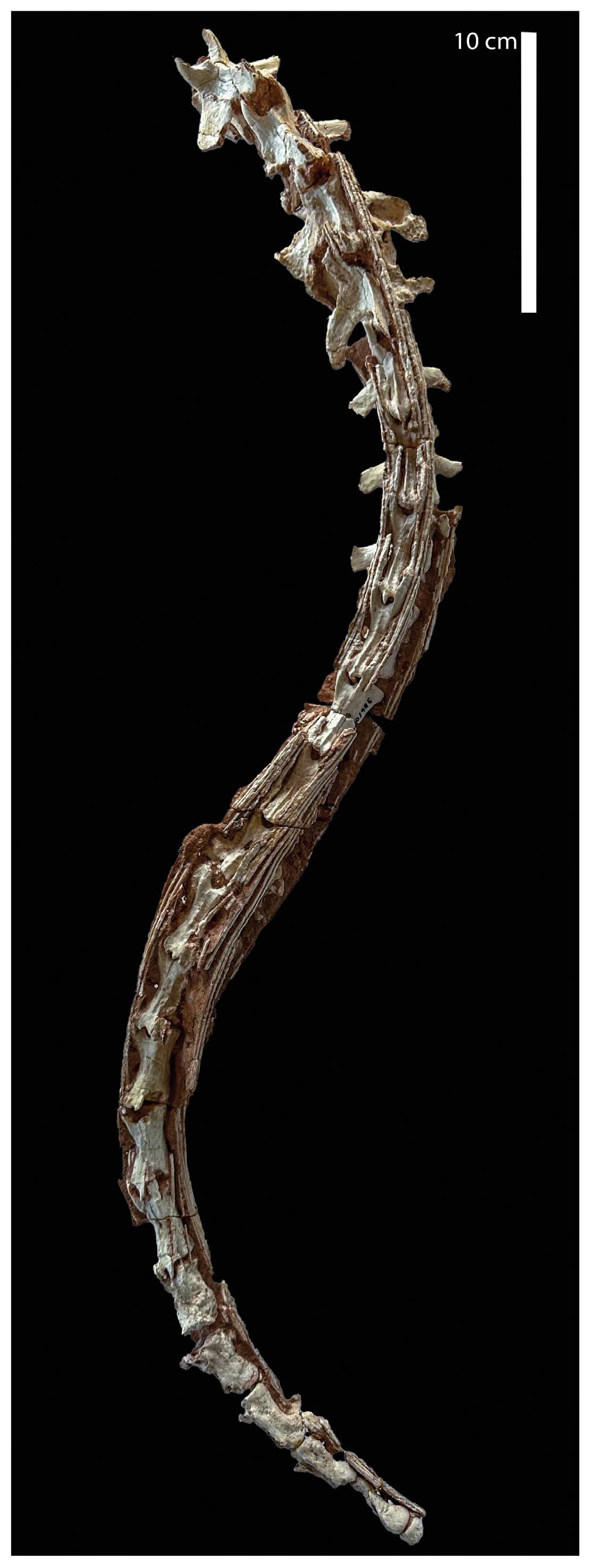 The tail comprises around 25 vertebrae, and the transition point between proximal and distal caudals occurs around the seventh caudal vertebra. Extremely elongated prezygapophyses and stiffened tendons originate from the posteriormost available vertebra and more anterior elements, and reach proximally to the fourth caudal. These structures would have made the majority of the tail very rigid.