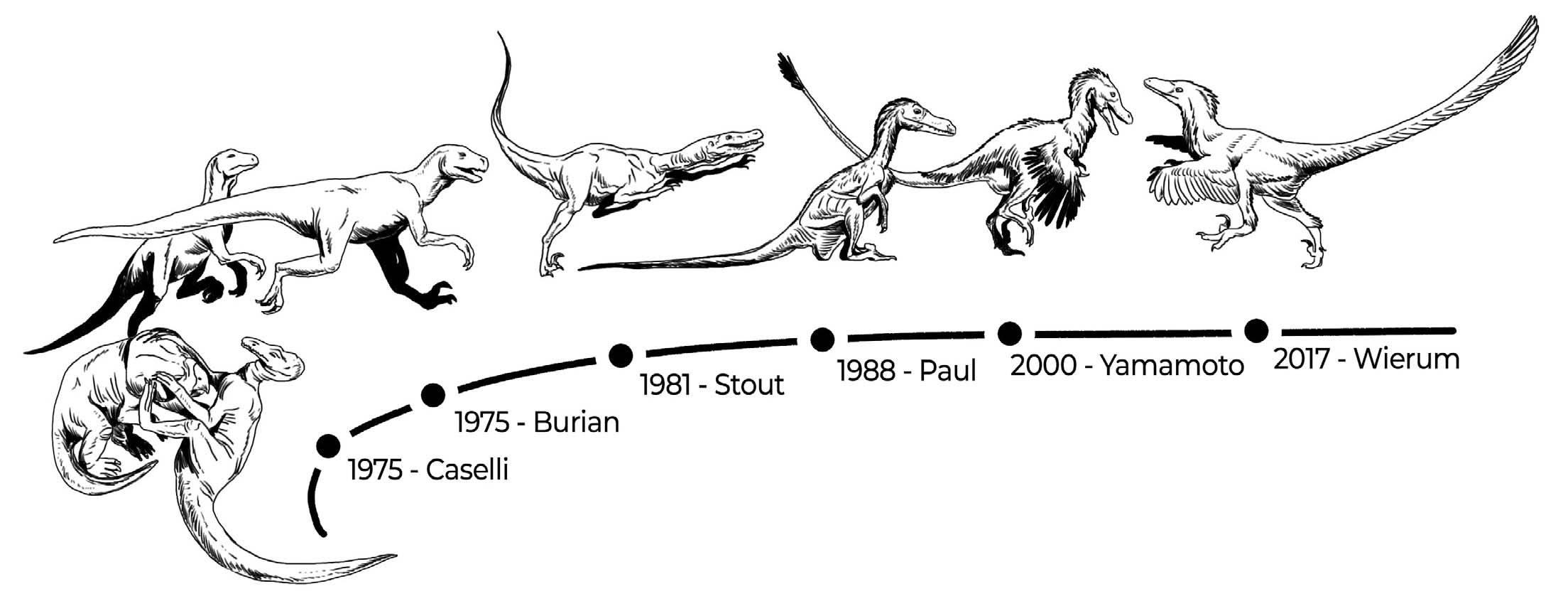 The discovery of the “fighting dinosaurs” brought Velociraptor to public attention almost fifty years after its initial discovery. The first reconstruction of Velociraptor depicting the battle with Protoceratops appeared in a 1975 book illustrated by Giovanni Caselli (Halstead, 1975). This book showcased many new and previously overlooked taxa, including the first-life reconstruction of Spinosaurus. However, Caselli’s depiction did not include the characteristic sickle claw on Velociraptor’s foot. The same year, the renowned palaeoartist Zdenek Burian also illustrated Velociraptor, portraying it in a dynamic pose but with a head shape more aligned with that of Deinonychus, a mistake later replicated by the Jurassic Park franchise. Throughout the 1980s, more accurate reconstructions began to emerge, thanks to the diligent efforts of palaeoartists such as Mark Hallett (Waldrop & Loomis, 1984) and Gregory Paul (Paul, 1988). These artists, along with Bakker (1986) were among the first to envision Velociraptor as a feathered dinosaur, anticipating the discovery of feathered dromaeosaurids in China in the following decades.