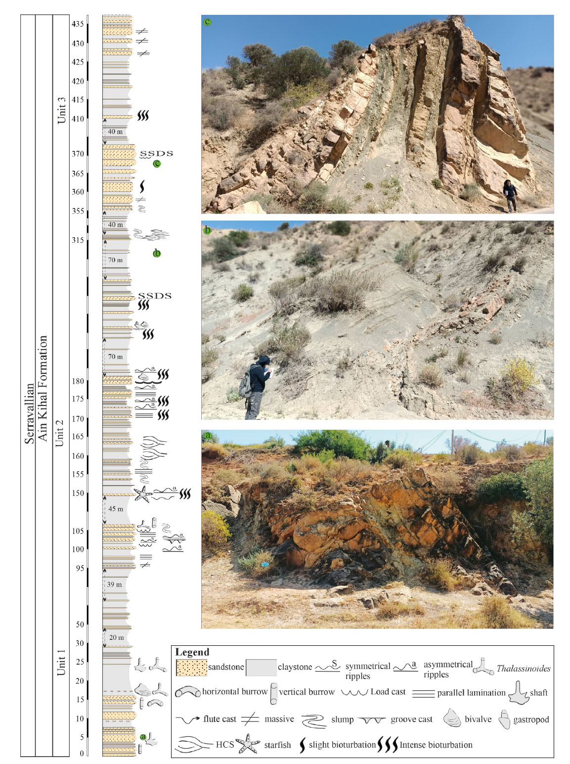 2) Facies analysis, displays sedimentation in environment under moderate energy, this revealed by marl dominance with very thick massive sandstone beds. The characteristics of Ain Kihal sandstone succession do not suggest a storm wave dominance. Only two levels bear small scale HSC and SCS. Another striking feature is the absence of SSDS in association with HCS, SCS and ripple marks. Evidence of tsunami waves as large-scale blocs, tsunamite sequence and amalgamated fauna is also absent.