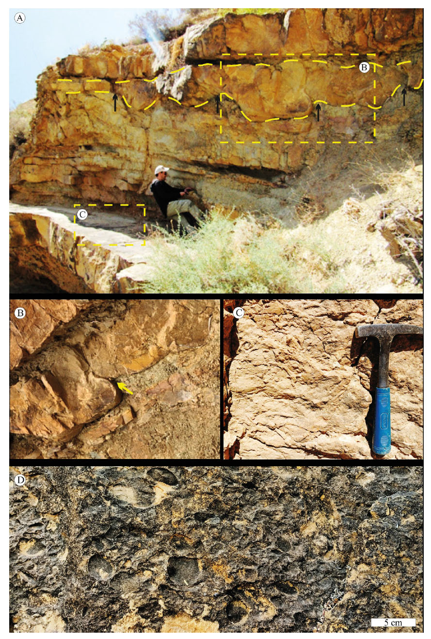-Soft-sediment deformation structures (SSDS) from the Middle Unit of Ain Kihal Sandstone Formation: (A) Load cast and flame structures (yellow arrows) from the Middle Unit, (B) close-up view from A, (C) close-up view from (A) displays high bioturbation of the underlying bed, (D) top of the sandstone beddisplays moderate rounded and moderate sorted mud clasts from the Lower Unit.