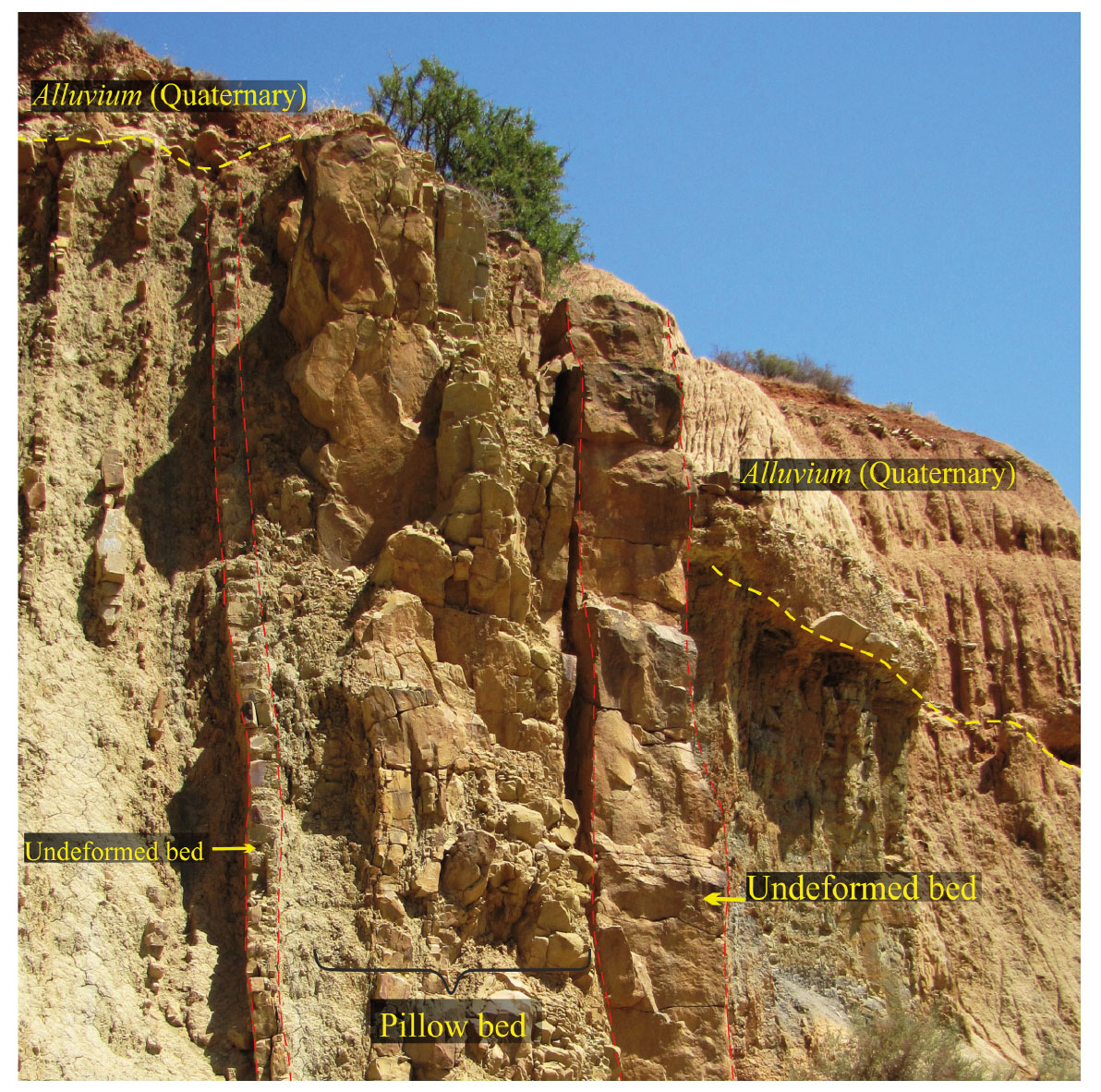 -Pillow bed from the Middle Unit, displays highly deformed sandstone bed bounded by two undeformed sandstone beds. The sandstone-marl succession is covered by the Quaternary Alluvium.