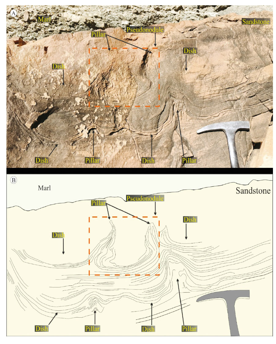 -Soft-sediment deformation structures (SSDS) from the Middle Unit of Ain Kihal Sandstone Formation: (A) dish and pillar structures from the Middle Unit, (B) sketch showing the two generations of dish and pillar structures associated with pseudonodule.
