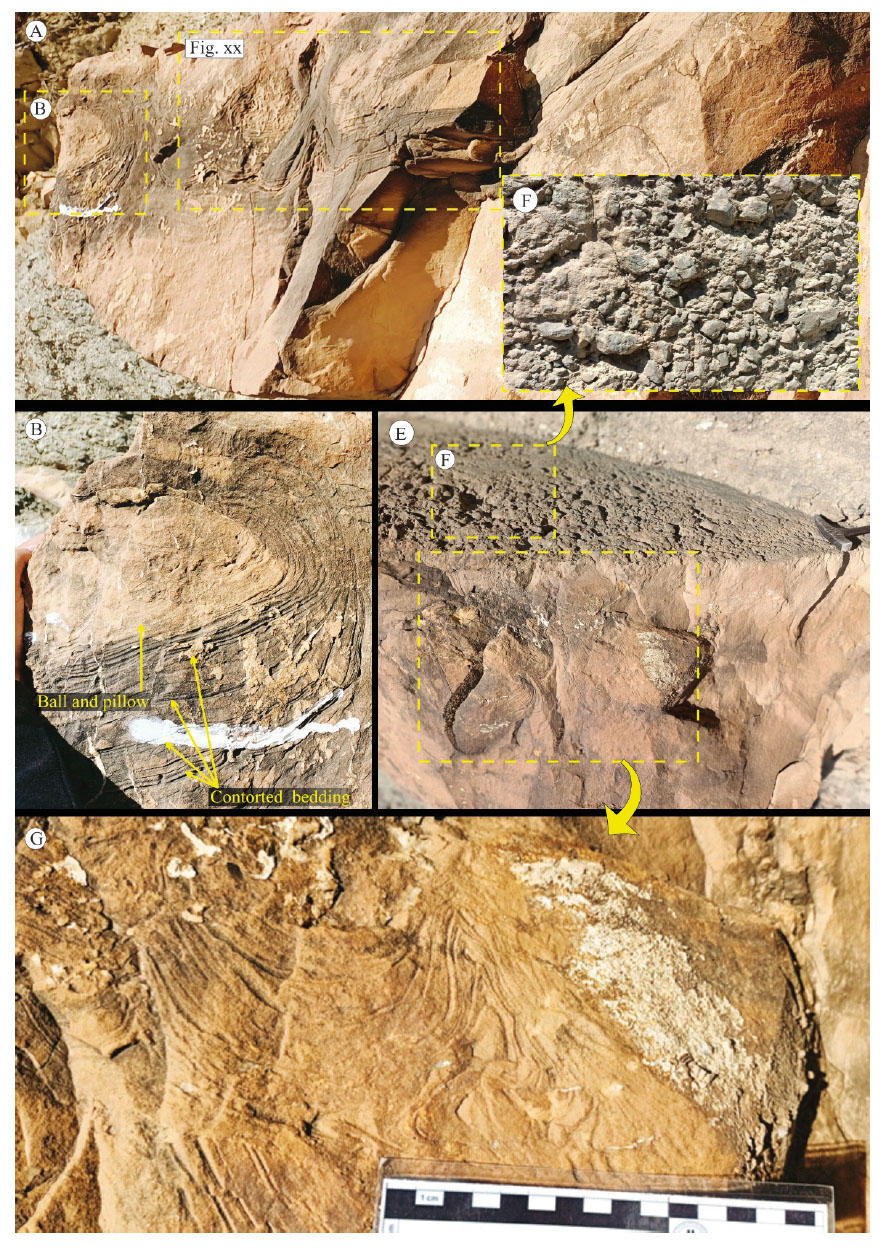 -Soft-sediment deformation structures (SSDS) from the Middle Unit of Ain Kihal Sandstone Formation: (A) massive sandstone bed bearing numerous SSDS, (B) ball and pillow structure associated with contored bedding, (C) Convolute laminations and autoclastic breccias, (D) close-up view from (C) displays convolute lamination, (E) close-up view from (C) displays autoclastic breccias.