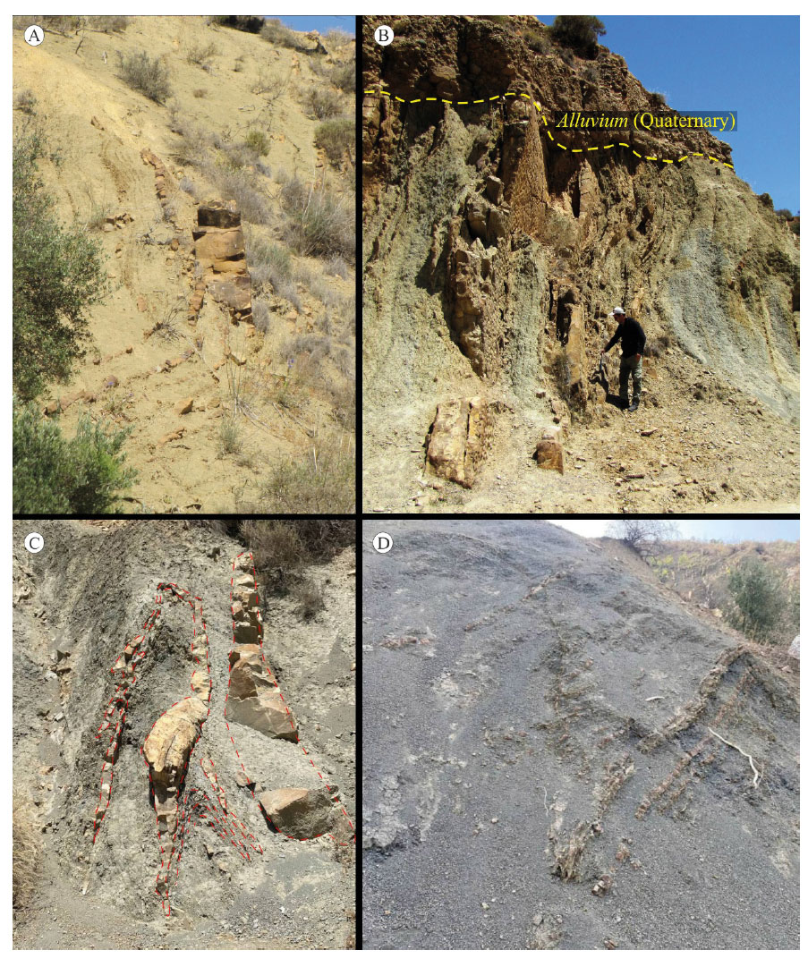Clastic dykes correspond vertically or obliquely oriented medium-grained brownish sands cutting laminated fine-grained sandstone and marl layers. These dykes were recorded from the Upper Unit of the Ain Kihal Sandstone Formation. The observed dykes can exceed 1.7 m in length (Fig. 8D) and have an average width of 7 cm. Figure 8D shows the maximum thickness at the base of the sand dyke. However, other dykes are thicker in their middle part. The original sandstone layers are relatively parallel to the sand dyke. Two different shapes of dykes were recognised; relatively rectilinear and zigzag. The sand dykes have almost the same directions. It is noteworthy to mention that the sandstone dykes occur next to the slump folds.