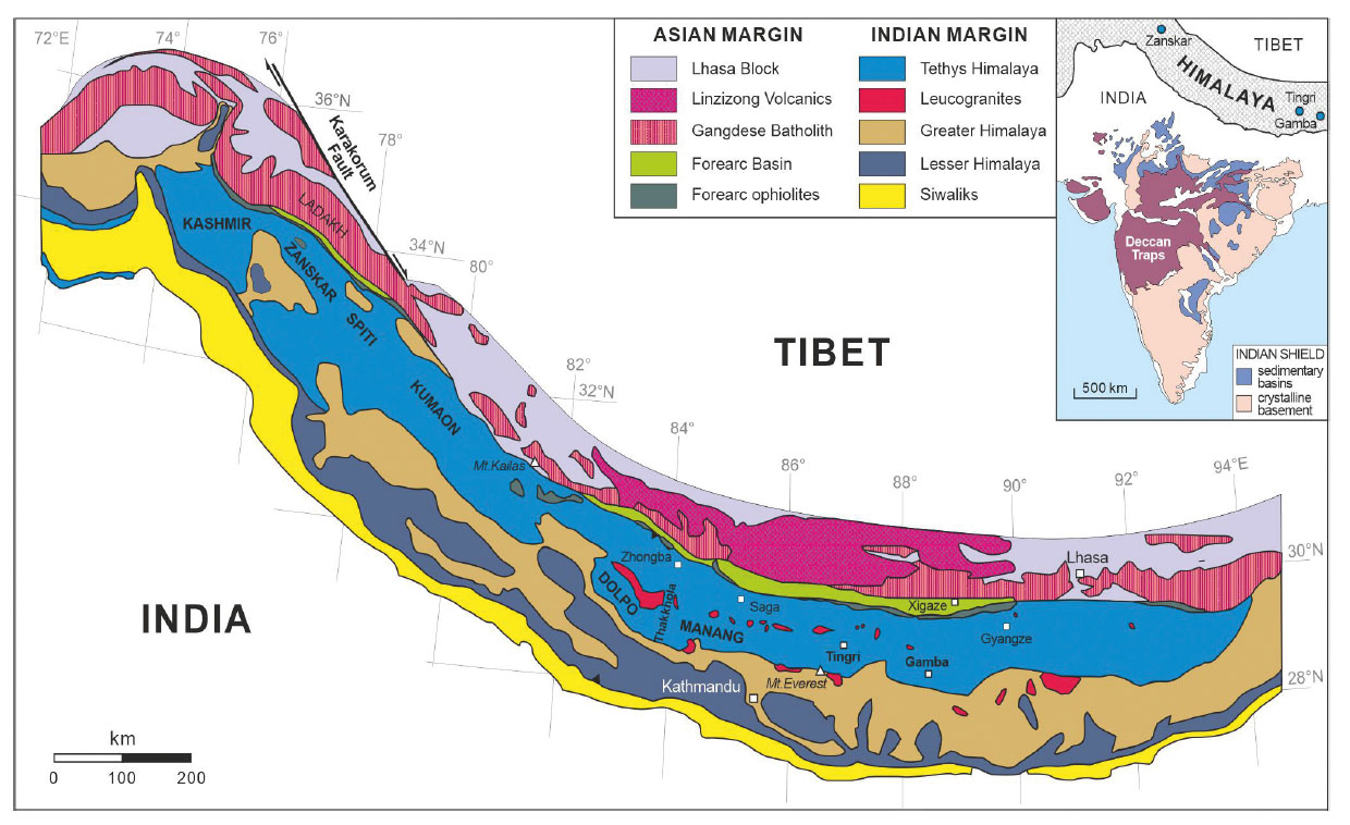 The Tethys Himalaya (also known as “Tibetan Zone”) is one of the major tectonic domains in the Himalayan Orogen, stretching for ~2000 km from Kashmir and the Zanskar-Spiti synclinorium in the northwest to South Tibet in the east (Fig. 1). Its northern boundary coincides with the Indus-Tsangpo Suture, separating the Tethys Himalaya from the Transhimalayan arc-trench system and the Lhasa Block to the north (Gansser, 1980), whereas the southern boundary is represented by the tectonic contact with the Greater Himalaya metamorphic rocks, commonly referred to as the South Tibetan Detachment System (Burg et al., 1984; Herren, 1987).
