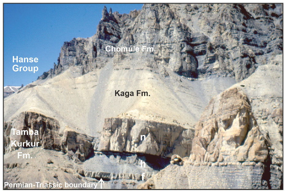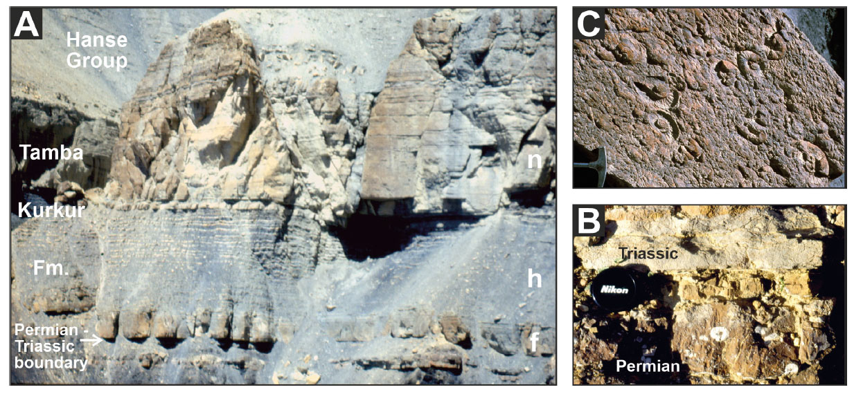 - Drowning at the Permian/Triassic boundary. A) Lower Triassic Tamba Kurkur Formation in Spiti (f = Griesbachian/early Dienerian first limestone band; h = late Dienerian/Smithian Hedenstroemia beds; n = latest Smithian/earliest Aegean Niti Nodular limestone). B) Sharp boundary between crinoid-bearing uppermost Permian limestones and lowermost Triassic limestones (Selong section, Tibet). C) Condensed ammonoid-rich limestone (Zanskar).